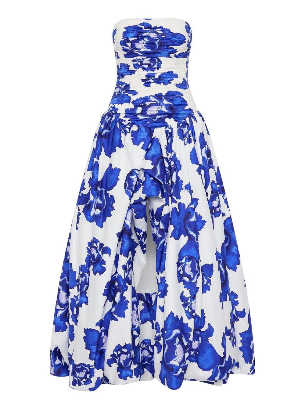 cobalt blue floral pattern strapless neckline gathered bodice back zip fastening