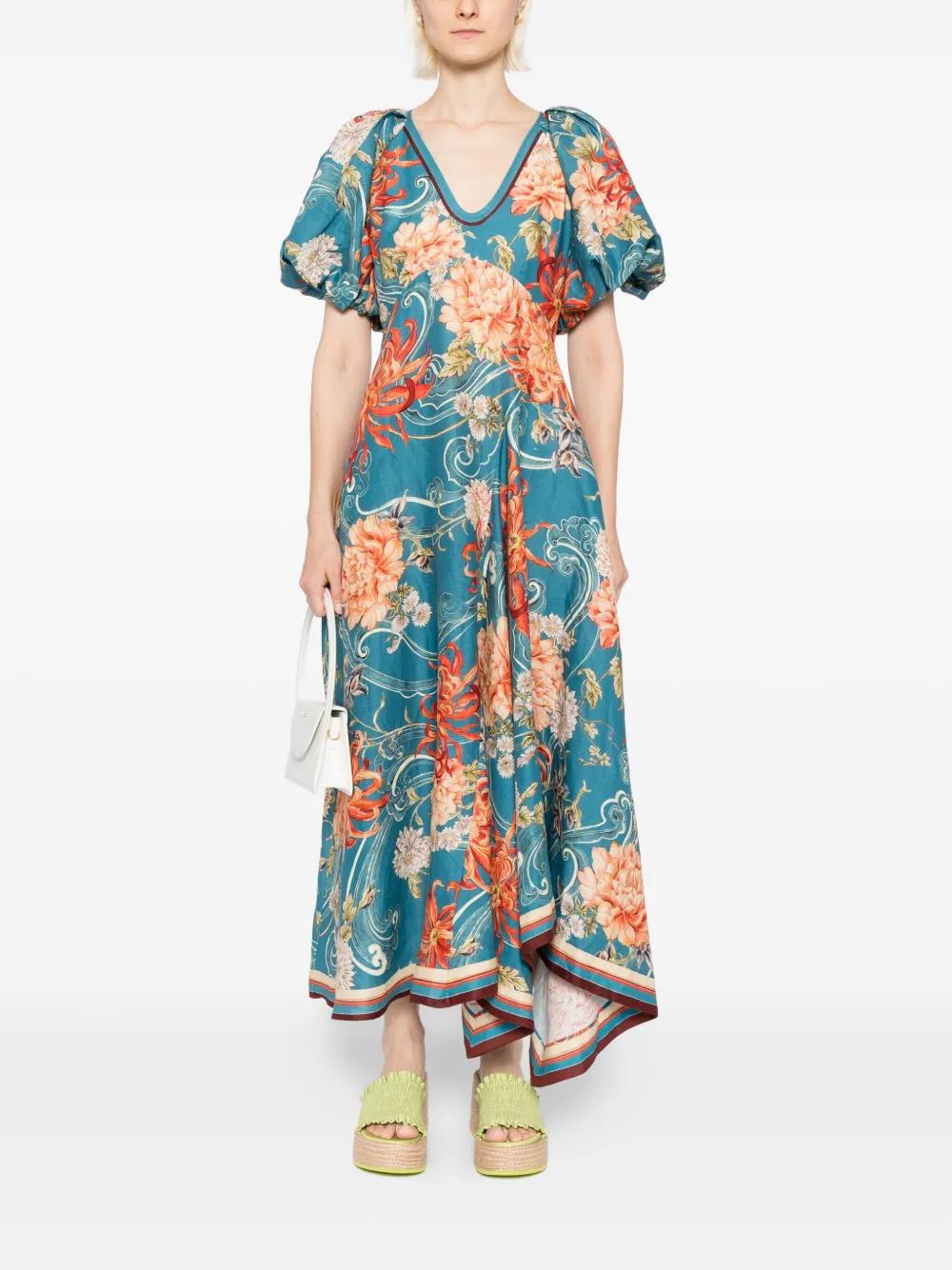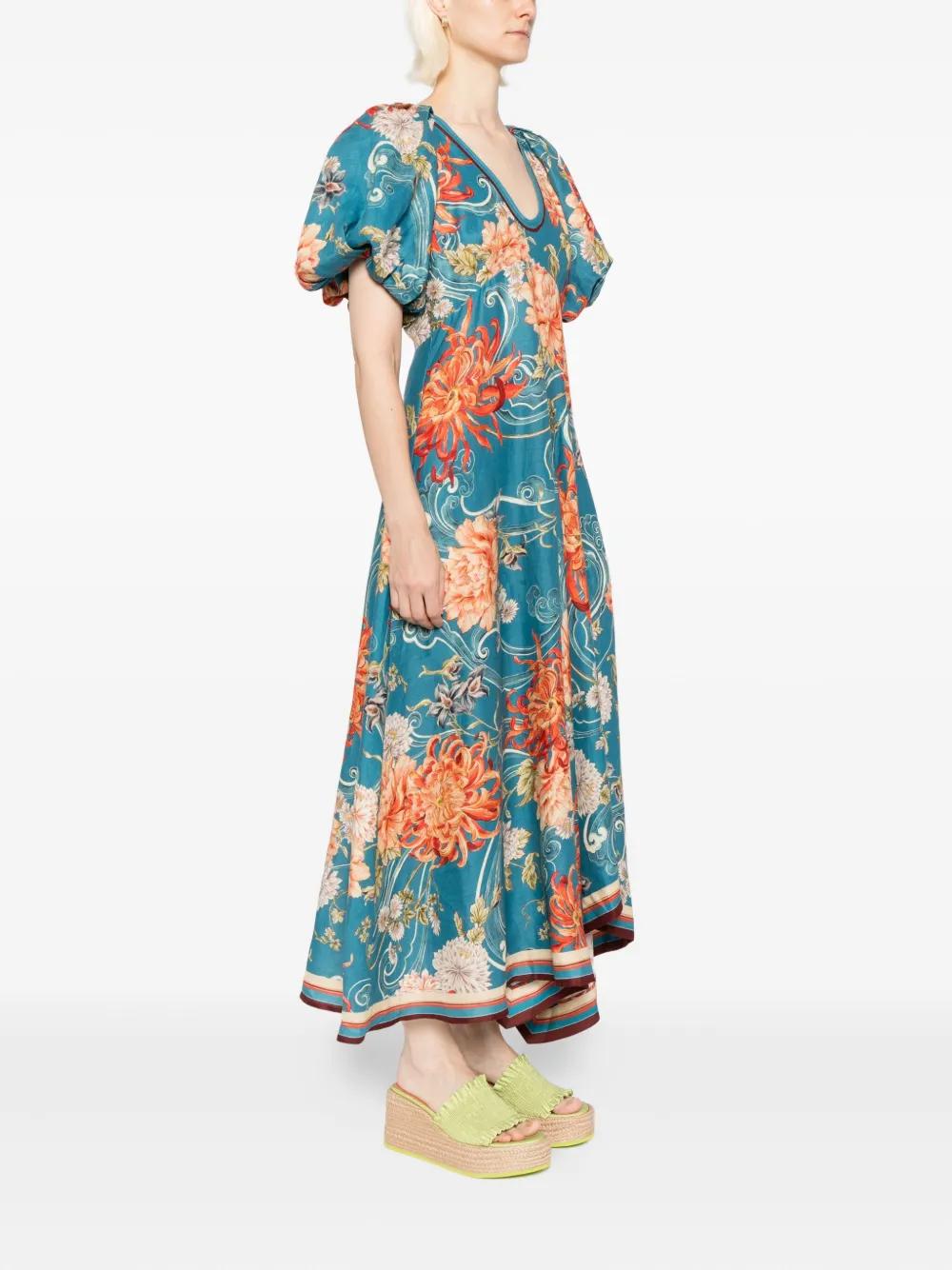 teal blue concealed rear hook and zip fastening short puff sleeves