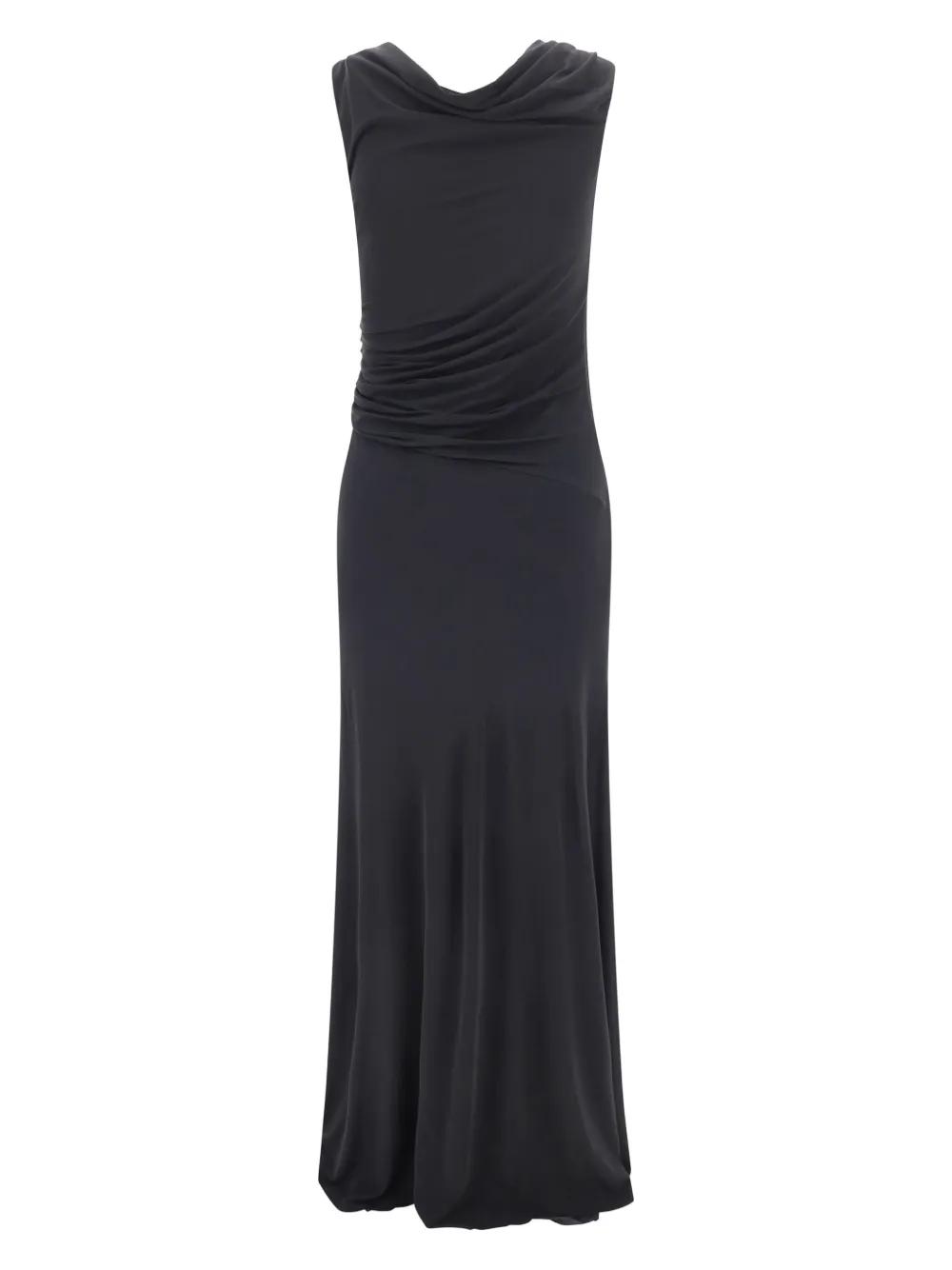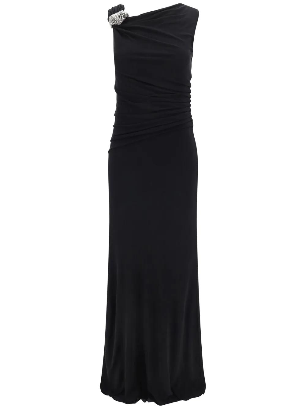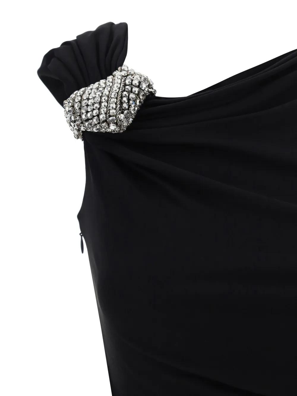 black asymmetric neck crystal embellishment sleeveless gathered detailing concealed rear zip fastening floor-length