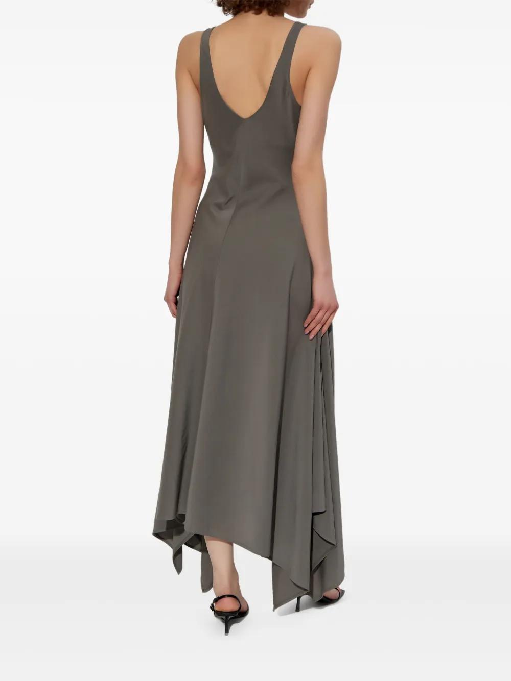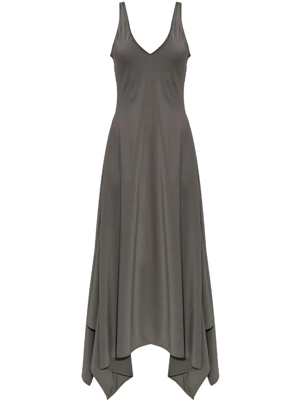 anthracite grey U-neck thin shoulder straps flared skirt asymmetric hem