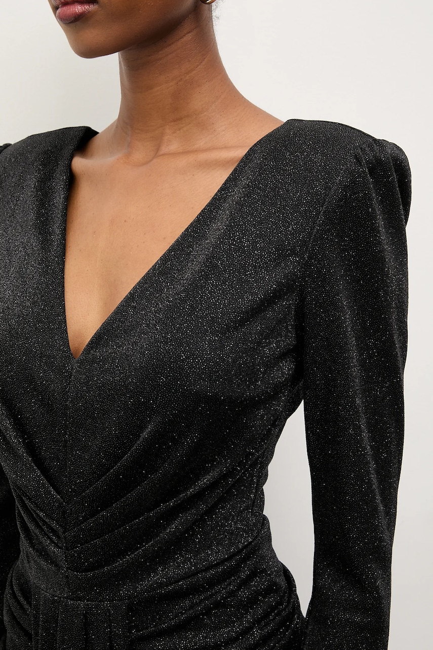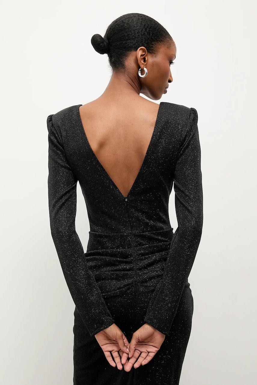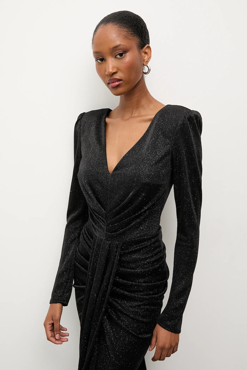 - Dopasowany fason z efektownymi marszczeniami. - Spiczasty dekolt. - Niewyjmowane wkładki lekko usztywniają i zapewniają dodatkowe krycie w biuście. - W ramiona wszyte poduszki. - Efektowne rozcięcie. - Dodatkowa warstwa materiału w postaci podszewki. - Z tyłu kryte zapięcie na suwak. - Długość rękawa: 66 cm. - Długość sukienki: 160 cm. - Szerokość pod pachami: 40 cm. - Wymiary podane dla rozmiaru: S.