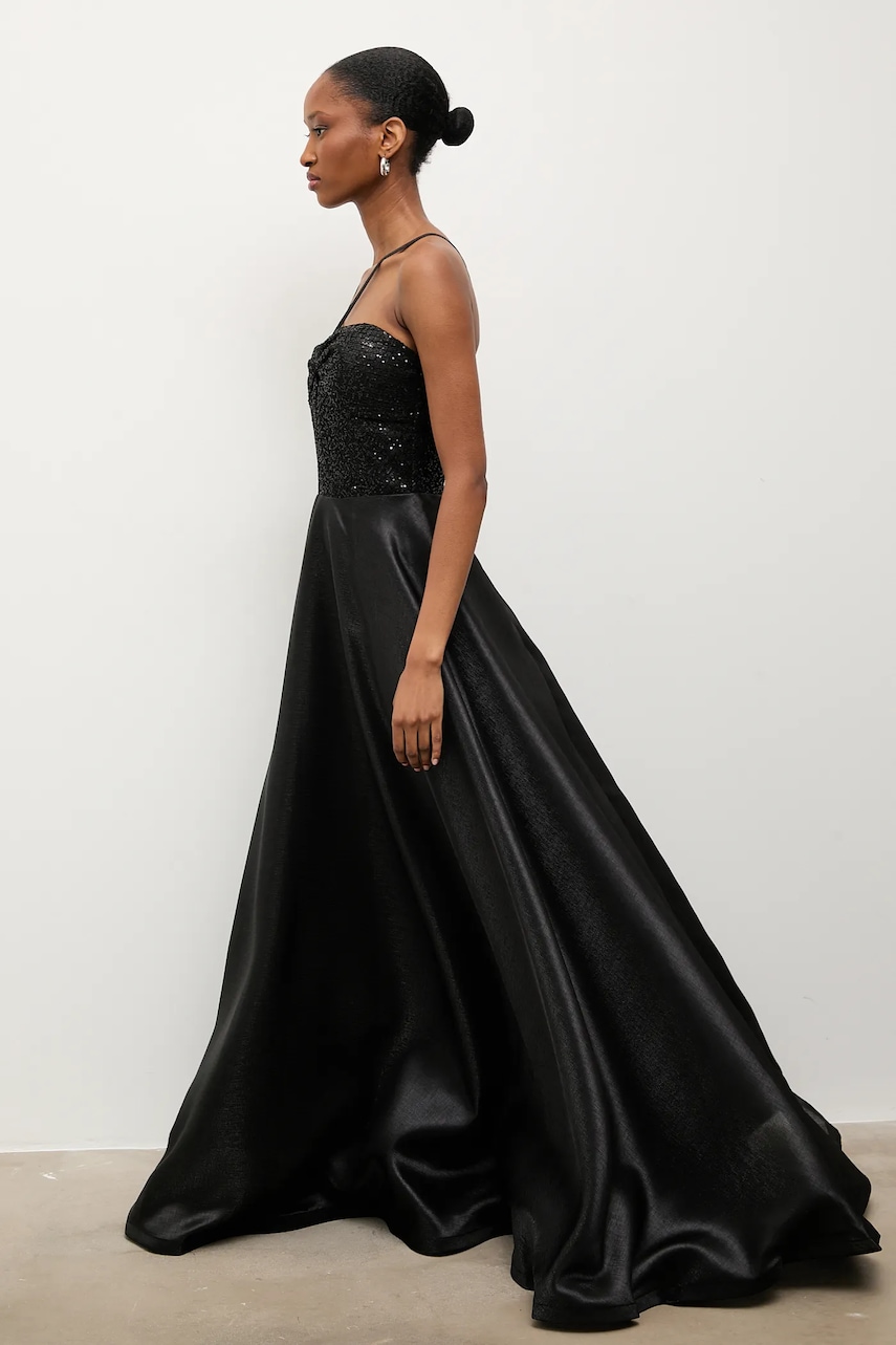 - Rozkloszowany fason. - Ozdobny, spiczasty dekolt. - Nieregulowane, nieodpinane ramiączka. - Z tyłu zapięcie na suwak. - Model na podszewce. - Model z bocznymi fiszbinami. - Wbudowane wkładki lekko usztywniają, dodatkowo stabilizują i unoszą biust. - Długość: 145 cm. - Szerokość pod pachami: 40 cm. - Szerokość w talii: 33 cm. - Wymiary podane dla rozmiaru: S.
