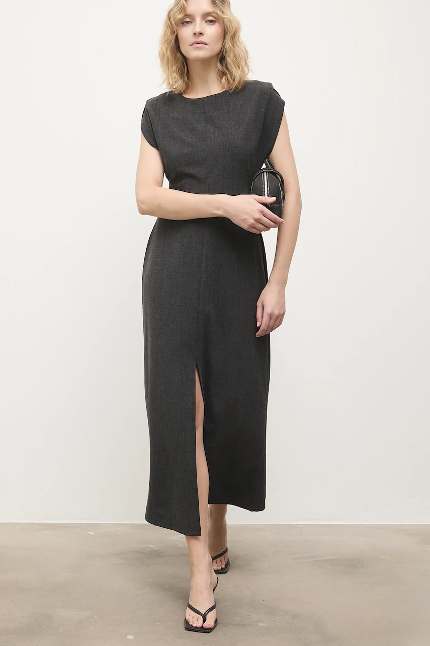 - Prosty, nie blokujący ruchów fason. - Klasyczny, okrągły dekolt. - Z tyłu kryte zapięcie na suwak. - Efektowne rozcięcie. - Model bez podszewki. - Długość: 132 cm. - Szerokość pod pachami: 36 cm. - Szerokość w talii: 41 cm. - Wymiary podane dla rozmiaru: S.