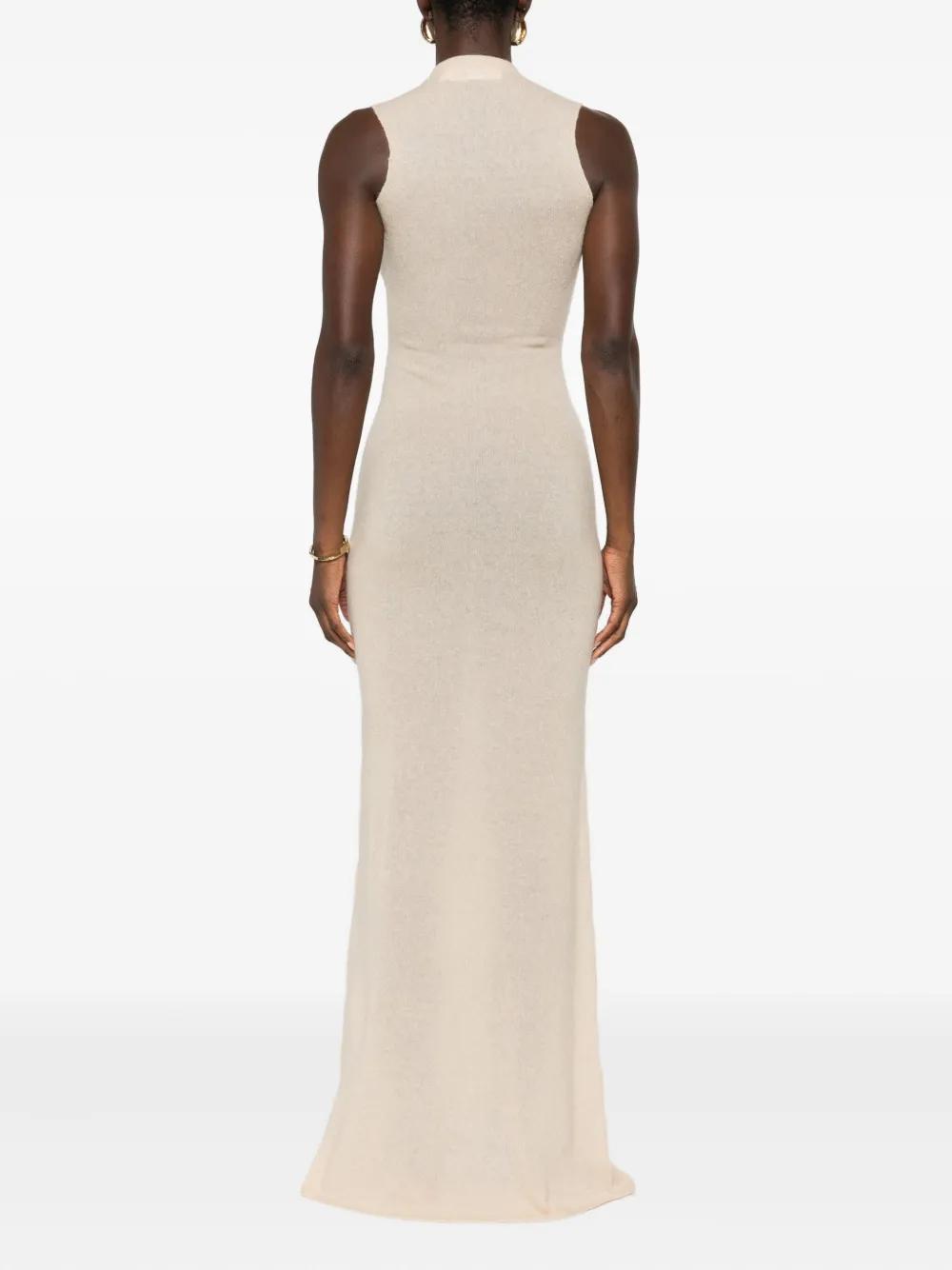 beige concealed side hook and zip fastening two side pouch pockets detachable sleeves sheer overlay