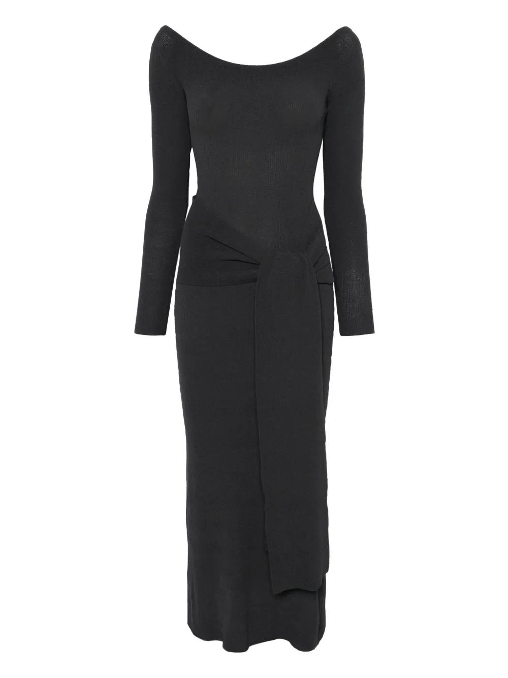 black jacquard logo motif mesh design rear zip fastening rear slit V-neck long sleeves maxi straight hem