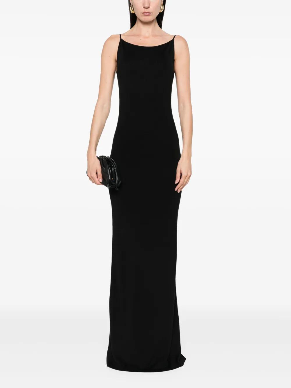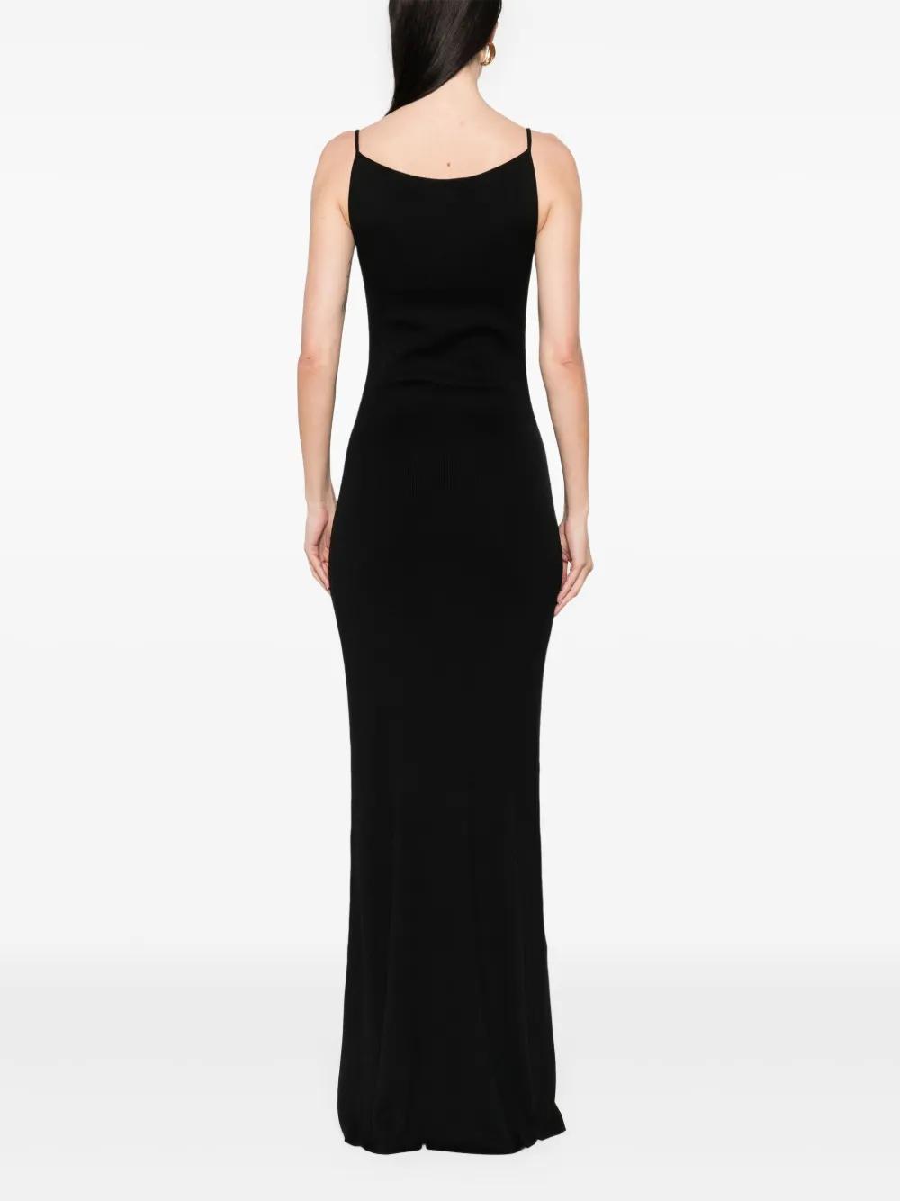 black jacquard logo motif mesh design rear zip fastening rear slit V-neck long sleeves maxi straight hem