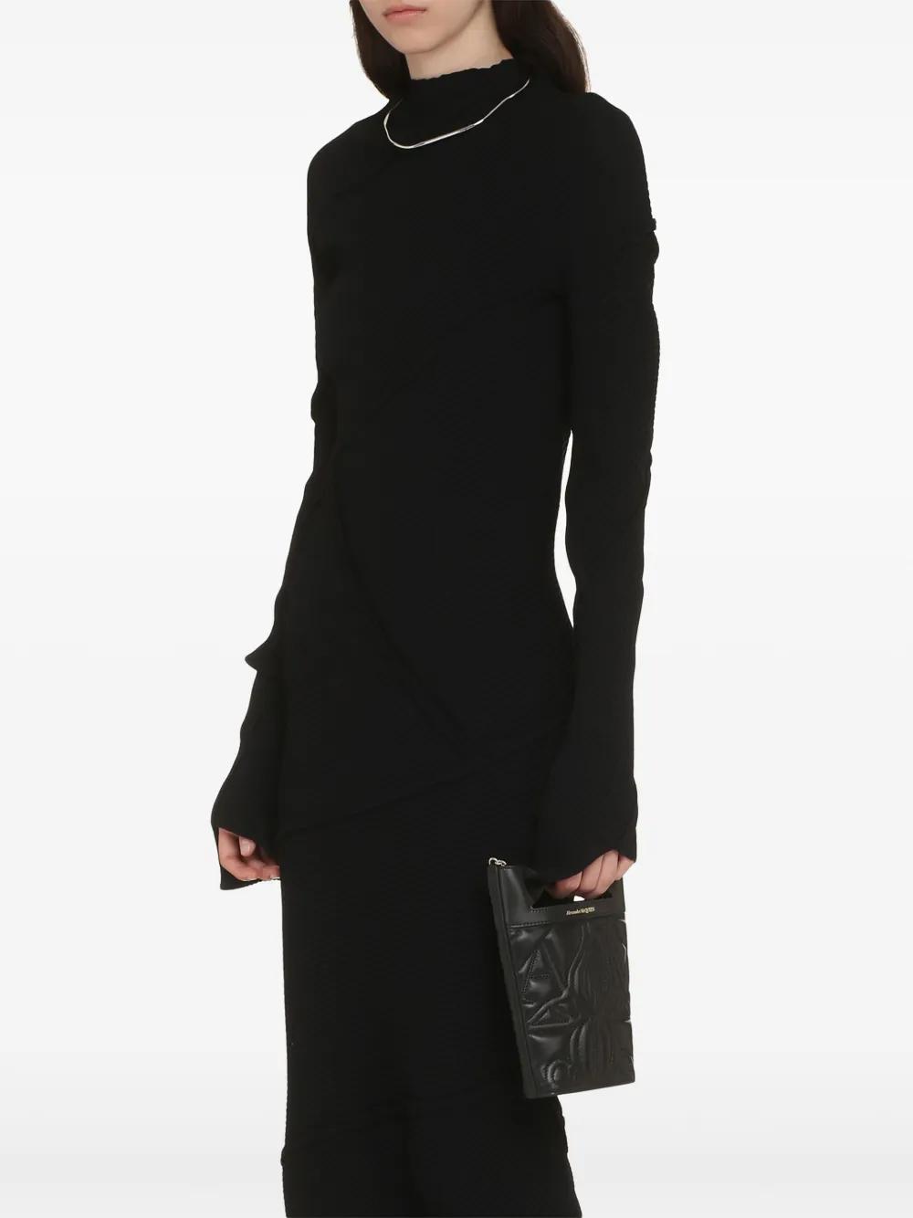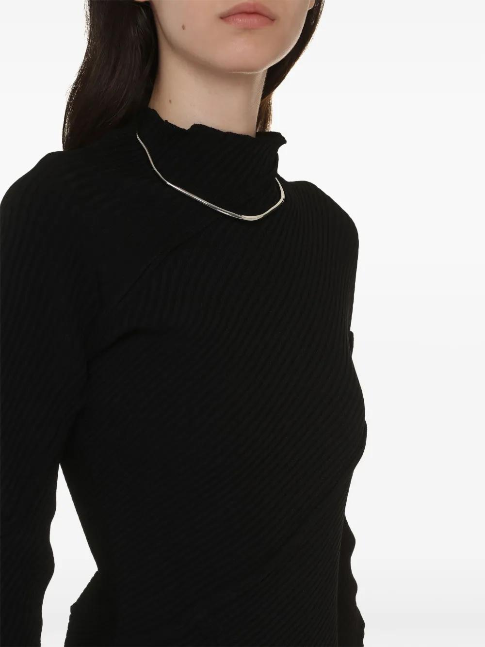 black FSC viscose ribbed knit inside-out effect seams asymmetric neck long sleeves long length asymmetric hem