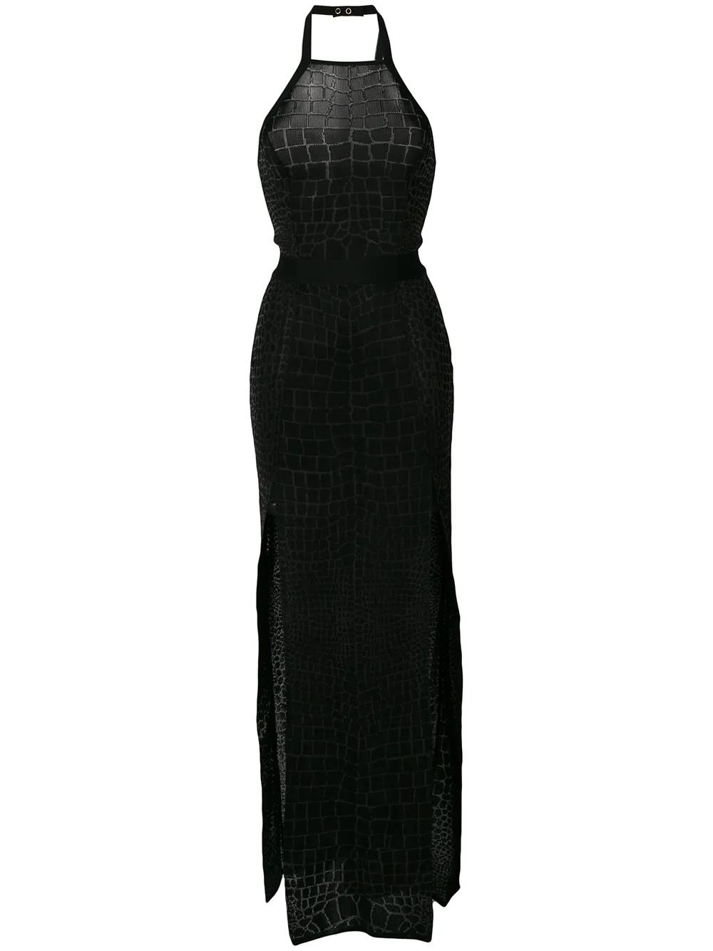 Olivier Rousteing implements a ‘more is more’ philosophy which showed no boundaries in Balmain’s AW17 collection. Expect a visually rich line-up of opulent fabrics, daring cuts and his signature decadent embellishing. Crafted in Italy, this crocodile effect gown exemplifies the creative director's aesthetic. A head-turning event piece, the dress boasts a halter neck, a fitted waist, a sleeveless design, an open back, a rear zip fastening, side slits and a long length.