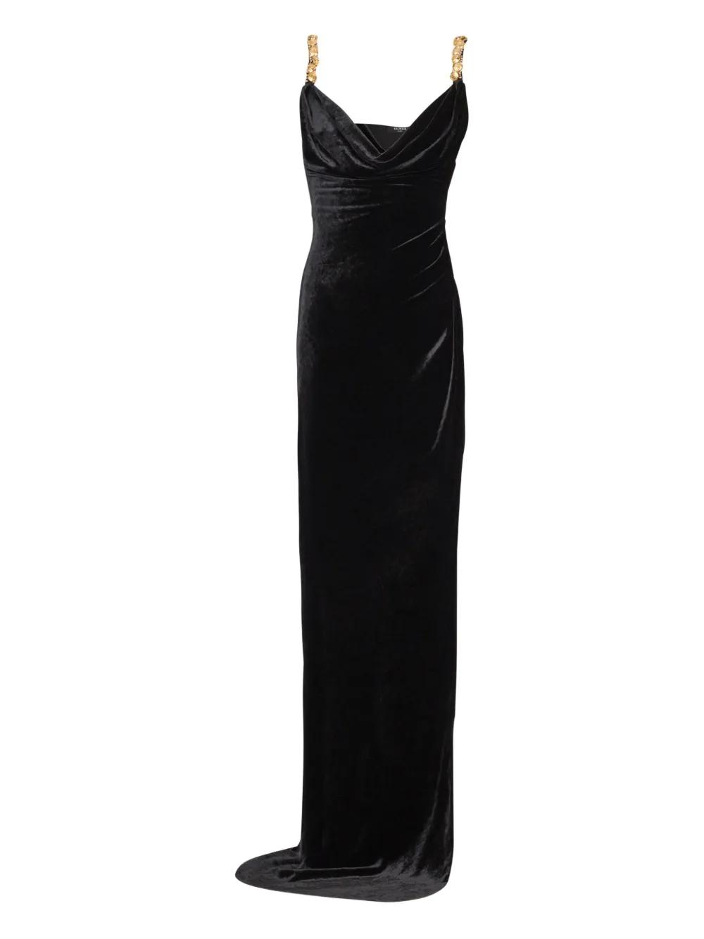 black velvet draped cowl neck gold-tone embellishments straps side slit floor-length hem