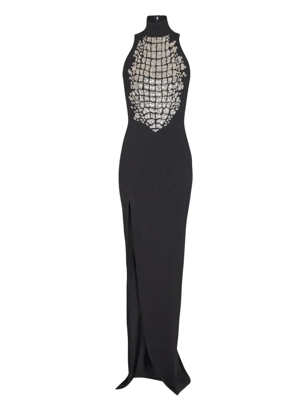 black high neck embellished crocodile design sleeveless bodycon thigh-high slit