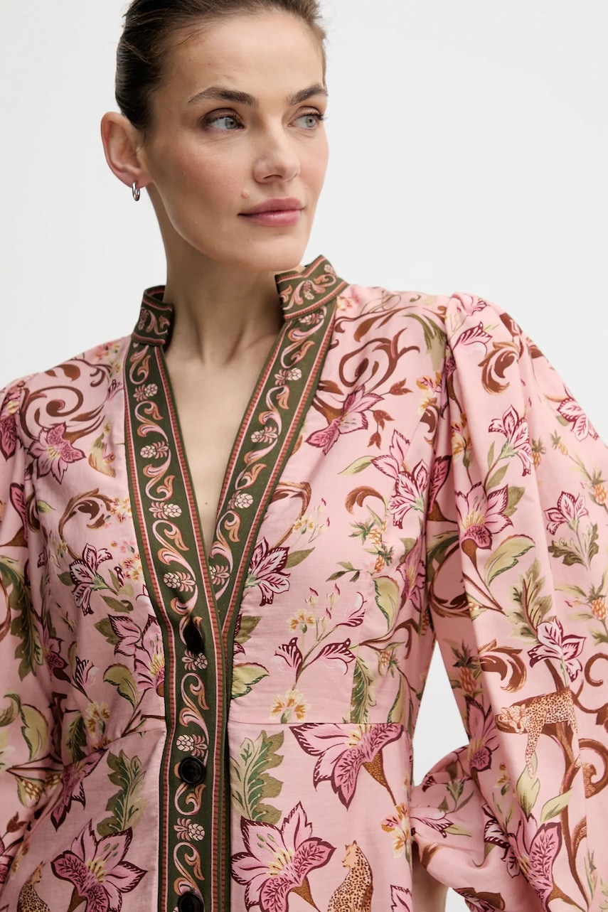 - Model wykonany z lyocellu, który powstaje w zrównoważonym procesie produkcji, bez wykorzystania toksycznych substancji. Materiał ten jest miękki i oddychający, idealny dla skóry wrażliwej, skłonnej do podrażnień. - Rozkloszowany fason. - Ozdobny, spiczasty dekolt. - Długie, bufiaste rękawy. - Rękawy wykończone wąskim, elastycznym ściągaczem. - Zapięcie na guziki umożliwia łatwe zakładanie i zdejmowanie. - Efektowne marszczenia.