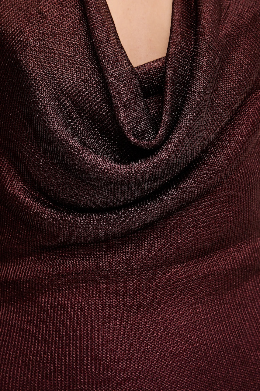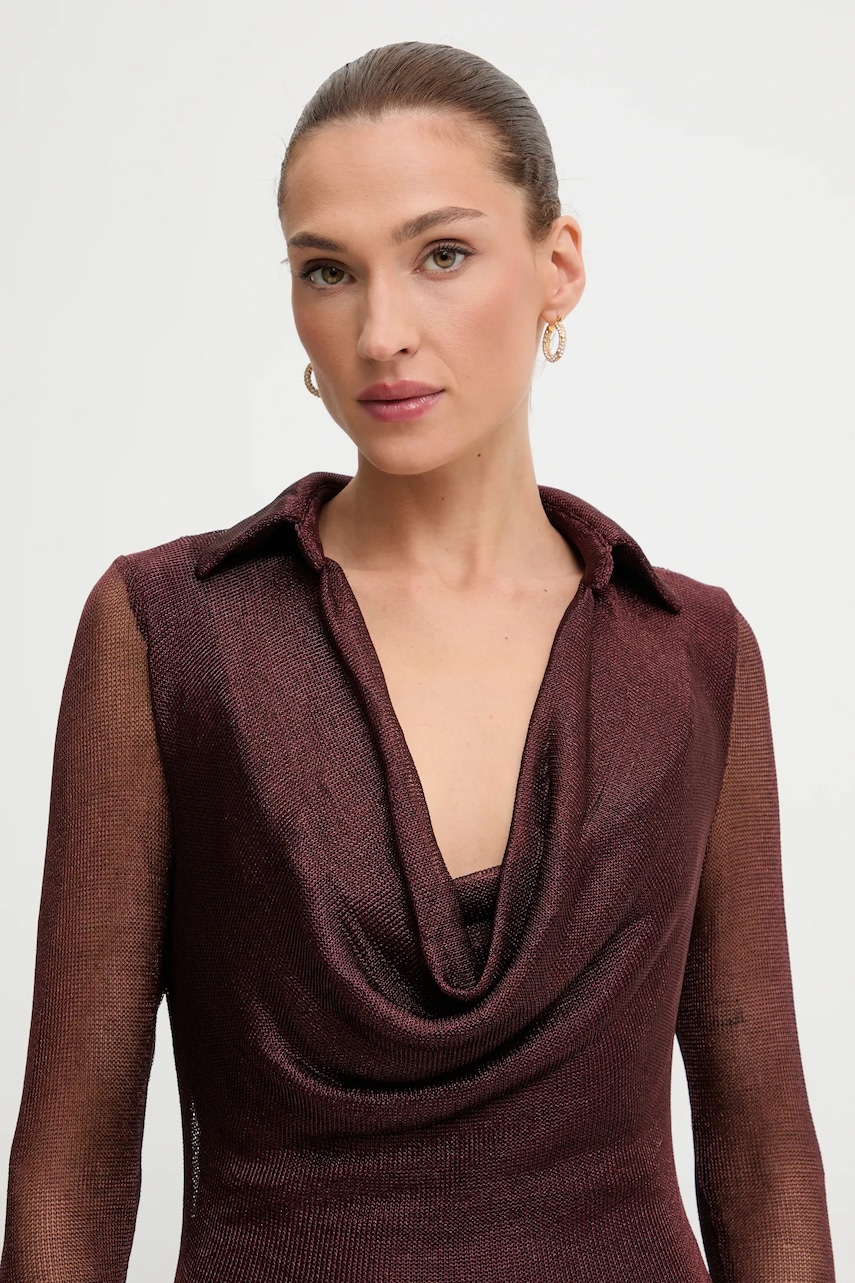 - Dopasowany, podkreślający sylwetkę fason. - Dodatkowa warstwa materiału w postaci podszewki. - Efektowny dekolt typu woda. - Materiał z metaliczną nicią. - Długość rękawa: 60 cm. - Długość: 136 cm. - Szerokość pod pachami: 35 cm. - Szerokość w talii: 28 cm. - Szerokość w biodrach: 33 cm. - Wymiary podane dla rozmiaru: S.