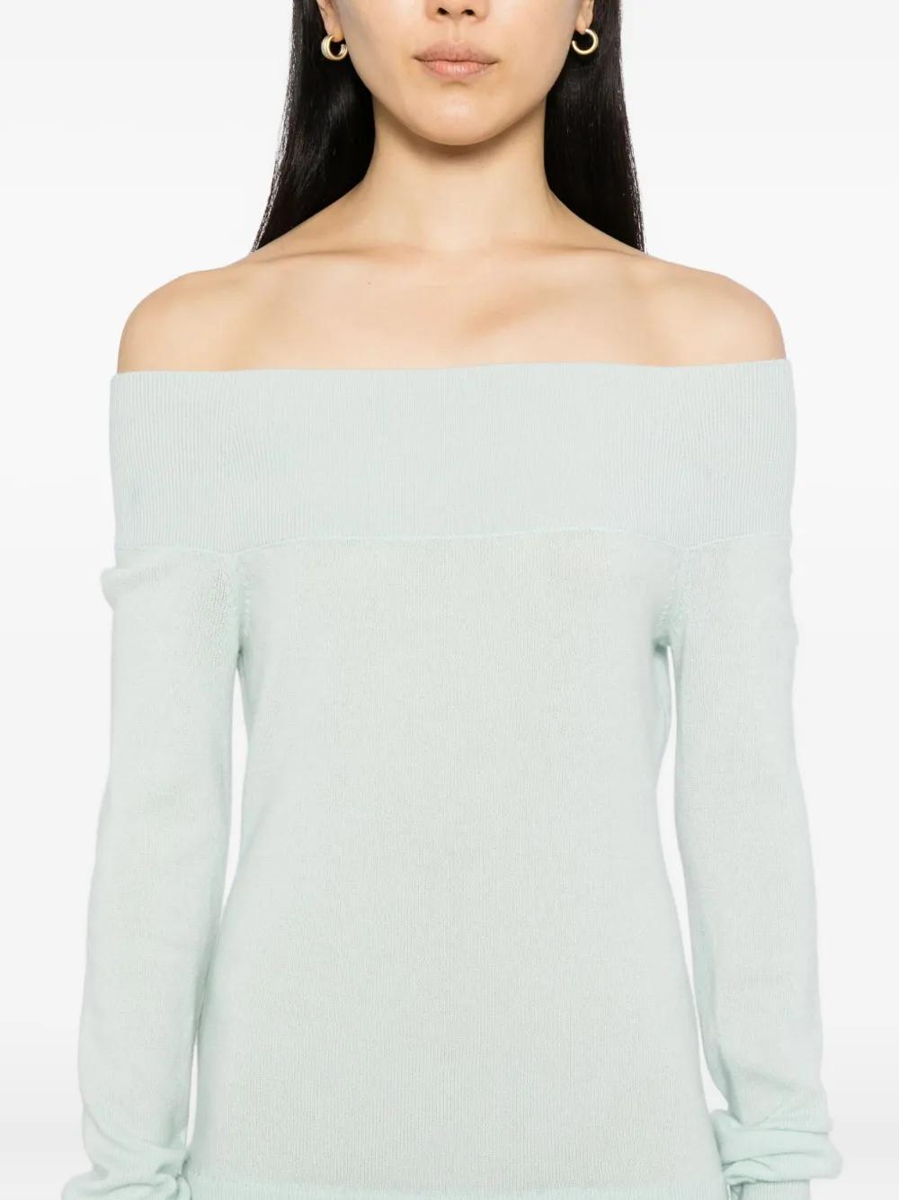 white/navy blue ribbed knit horizontal stripe pattern sheer panel to the chest high neck long sleeves full-length straight hem rear keeper loop pull-on style