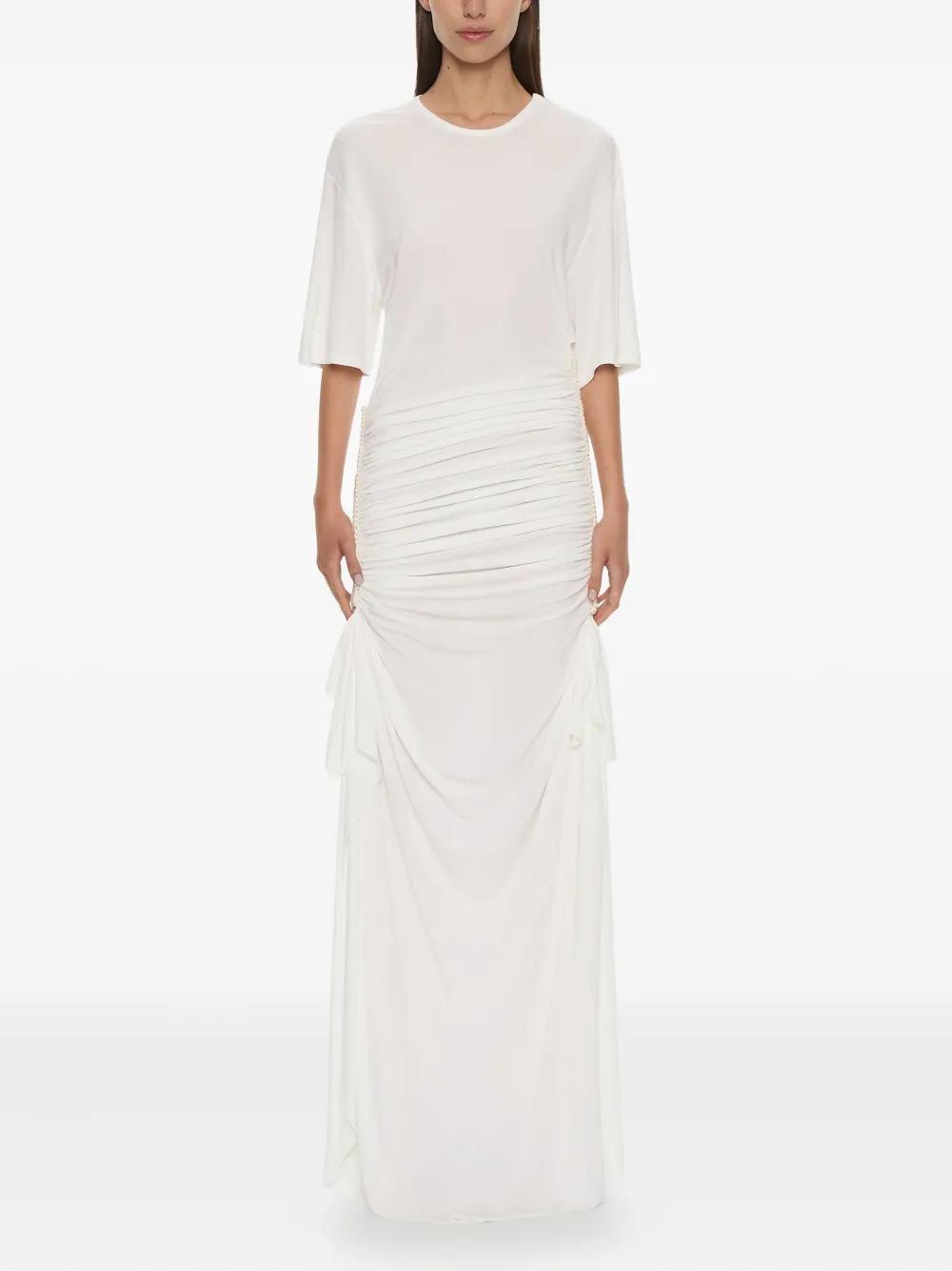 white jersey fabric ruched detailing short sleeves floor length