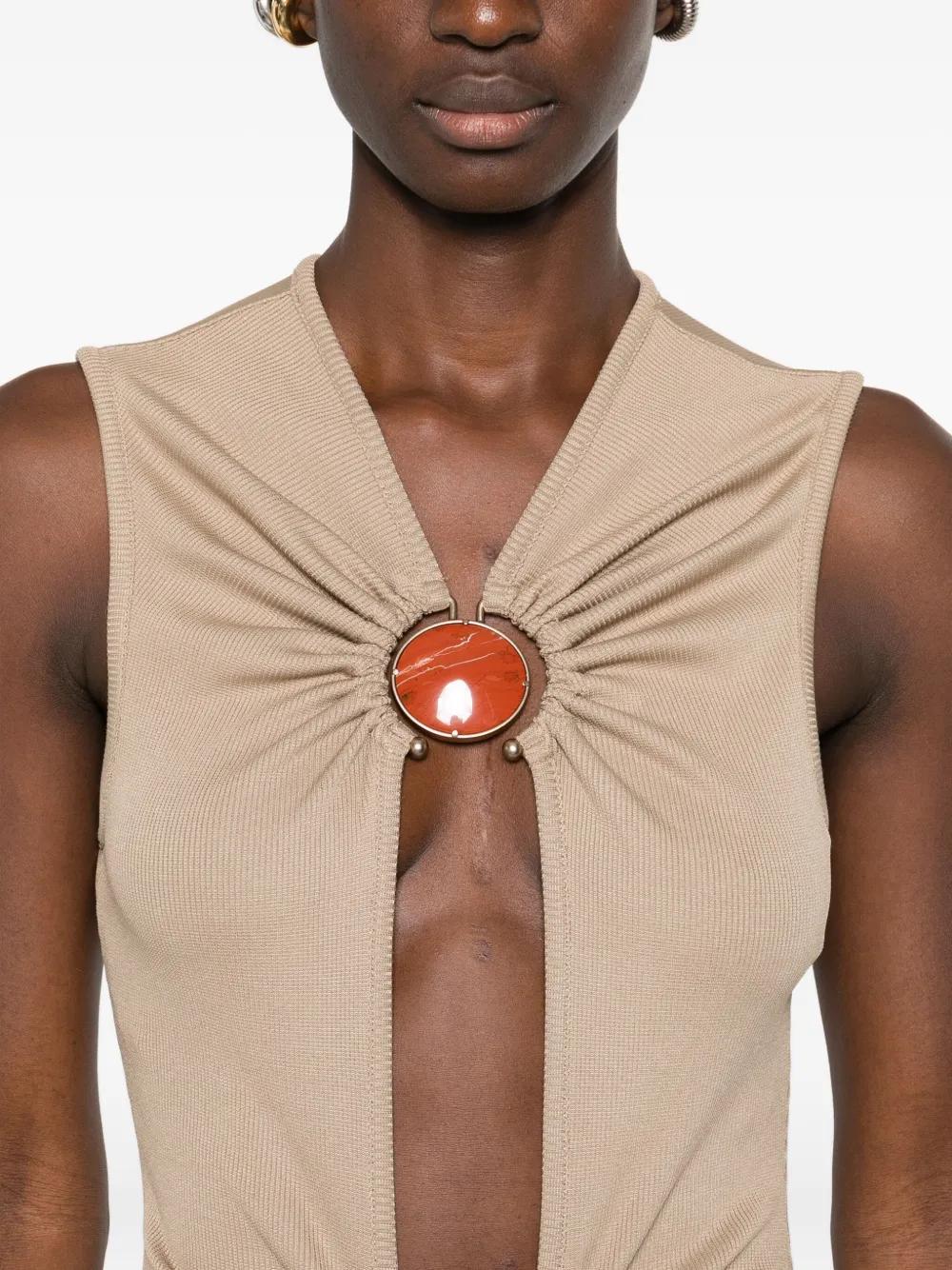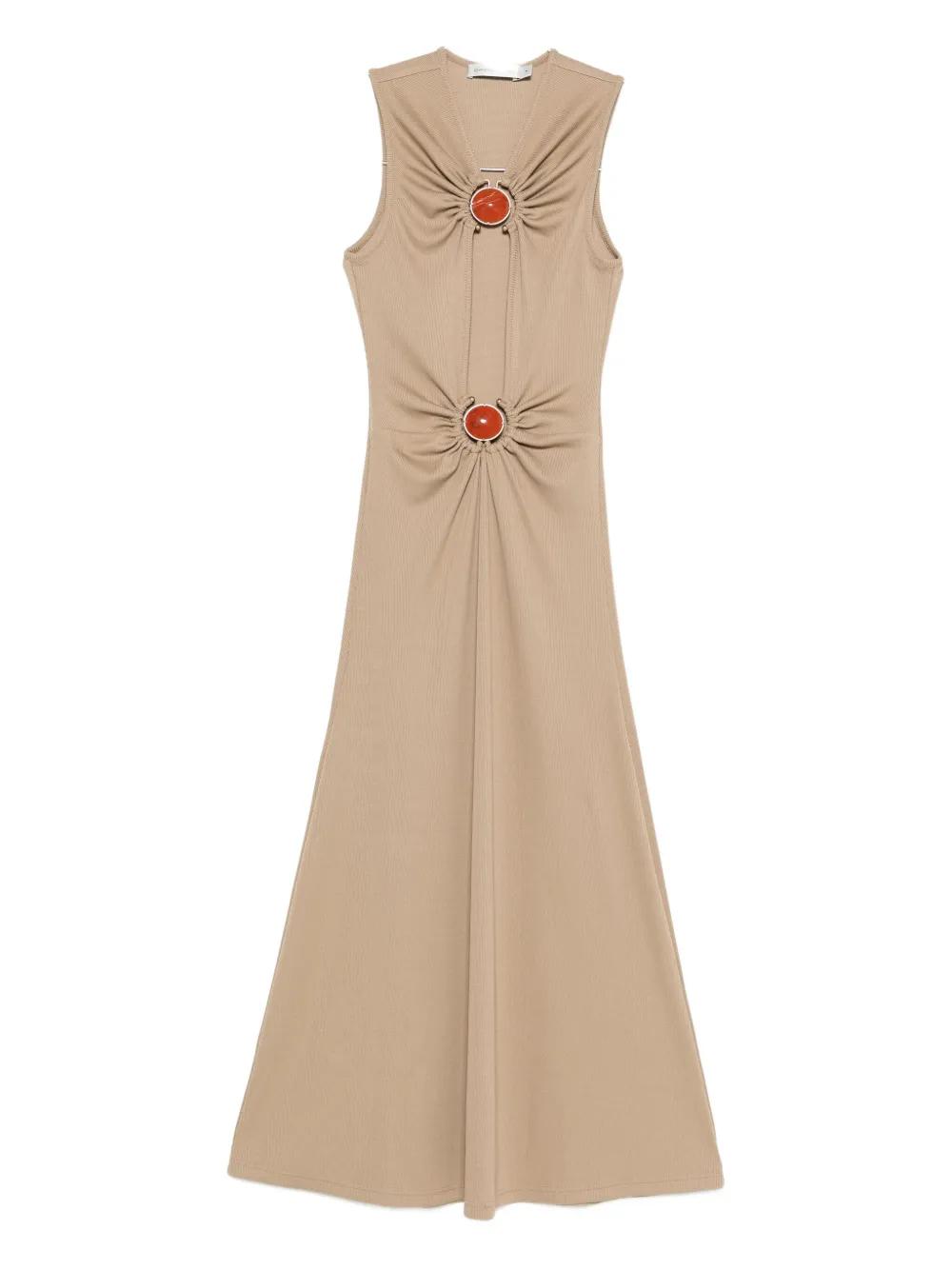 sand beige stone detail ruched detailing sleeveless round neck A-line skirt