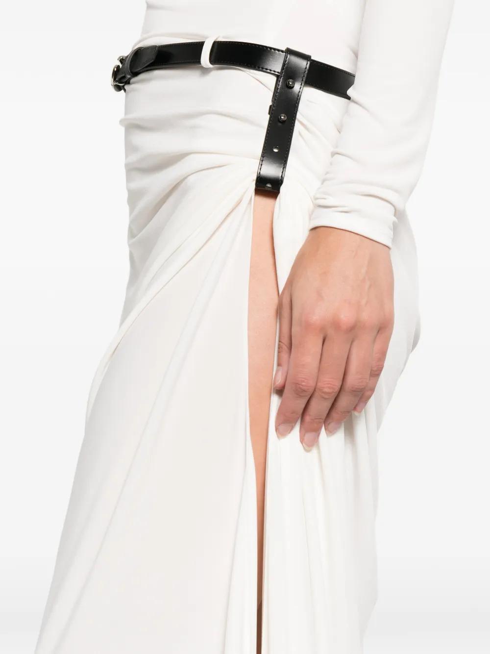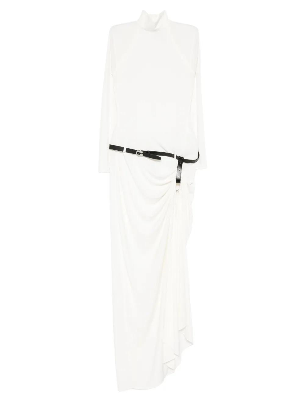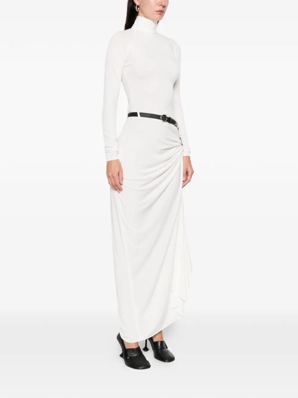 white turtleneck long sleeve belted draped detail asymmetric hem