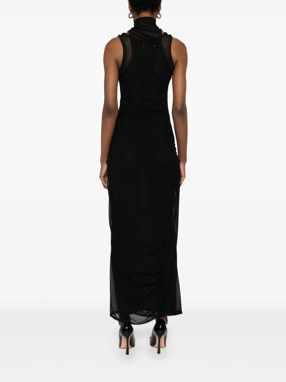 black mesh design semi-sheer construction layered design high neck sleeveless cut-out detailing ruched detailing unlined straight hem long length