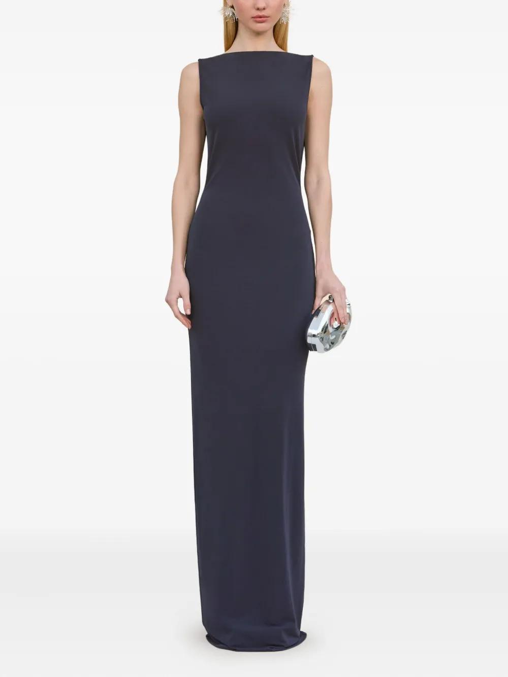 dark blue cowl back sleeveless open back floor-length straight neckline