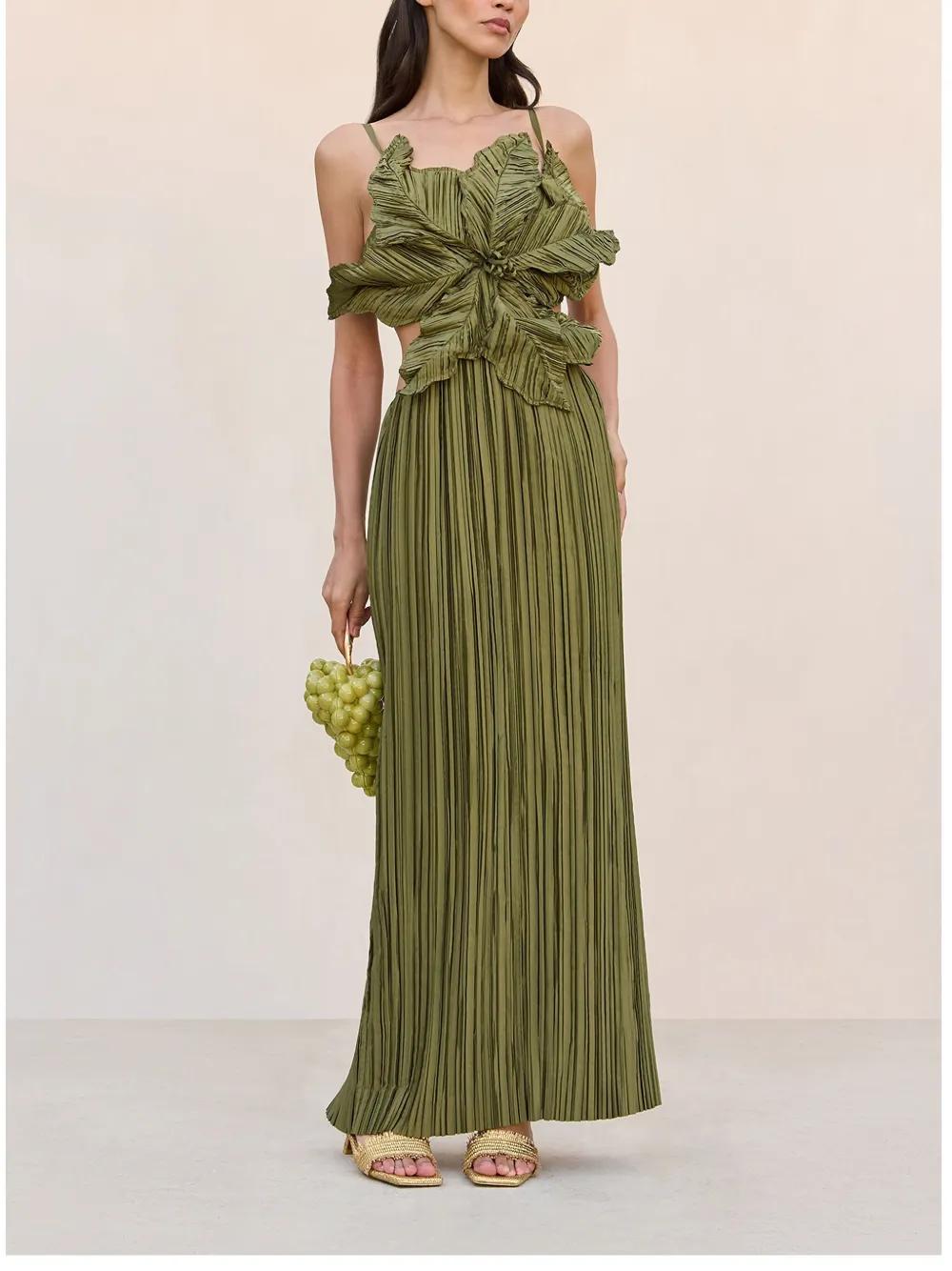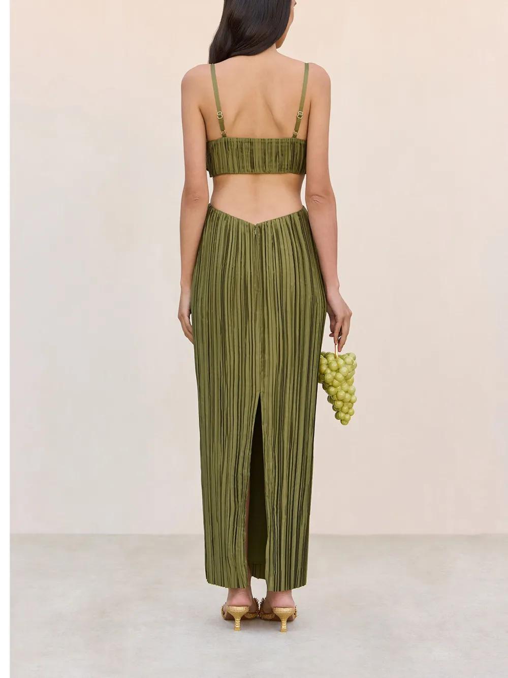 green concealed rear hook and zip fastening plissé effect adjustable spaghetti straps rear slit