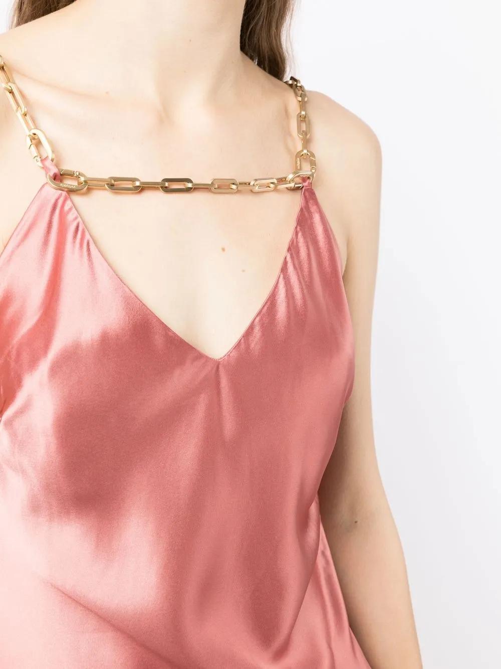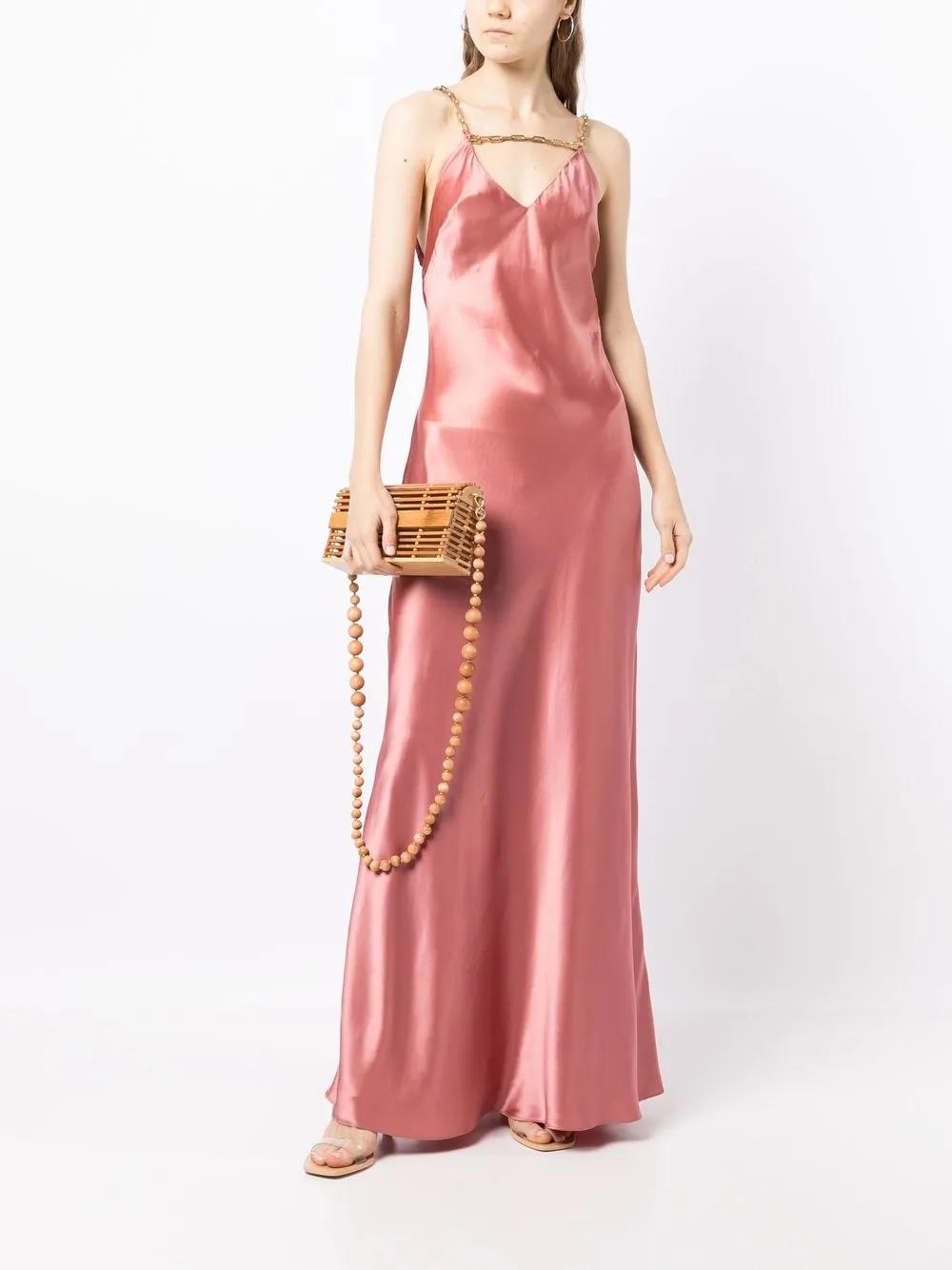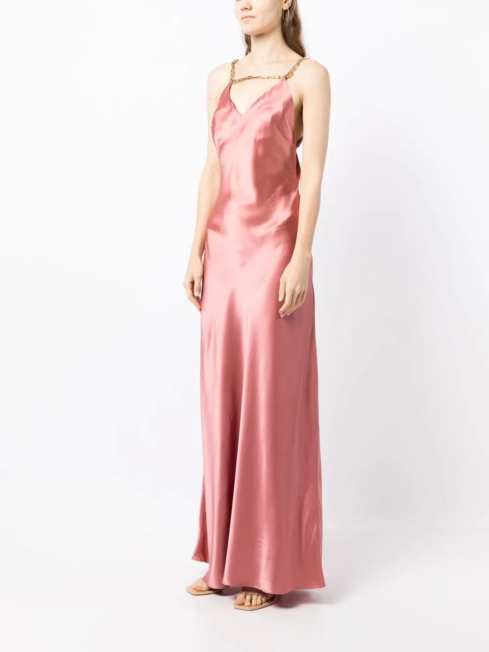 blush pink satin finish chain-link detailing gold-tone hardware V-neck spaghetti straps low back floor-length