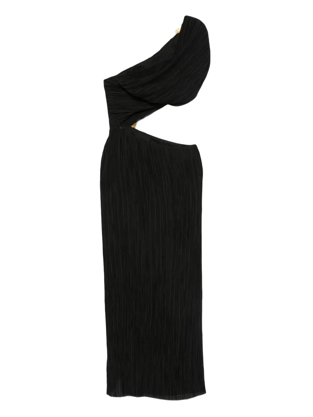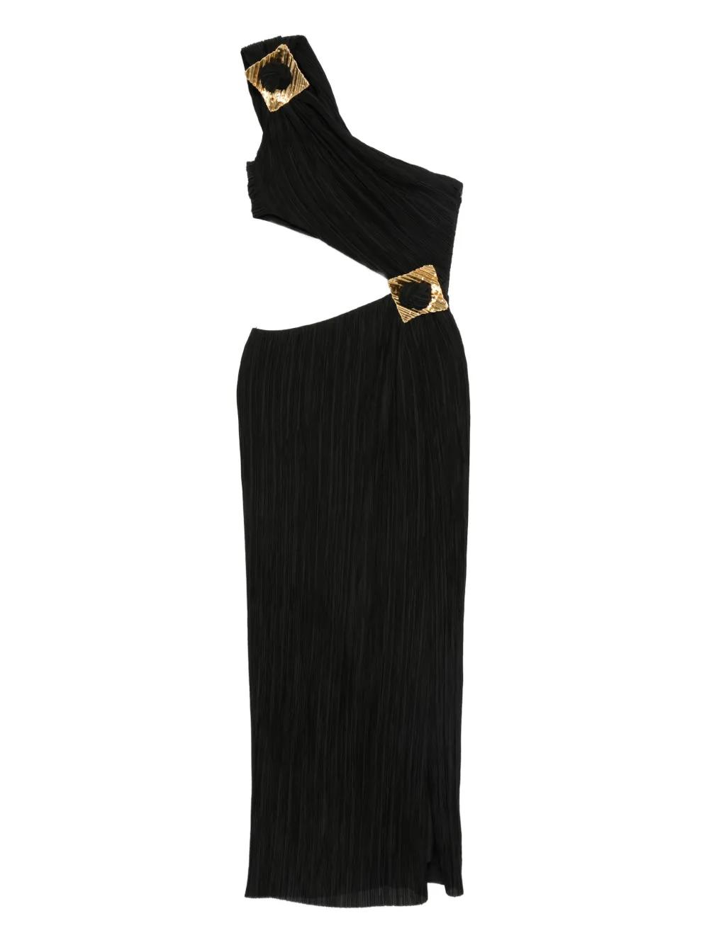 black pleated fabric cut-out detail one-shoulder design gold-tone embellishments asymmetrical hemline