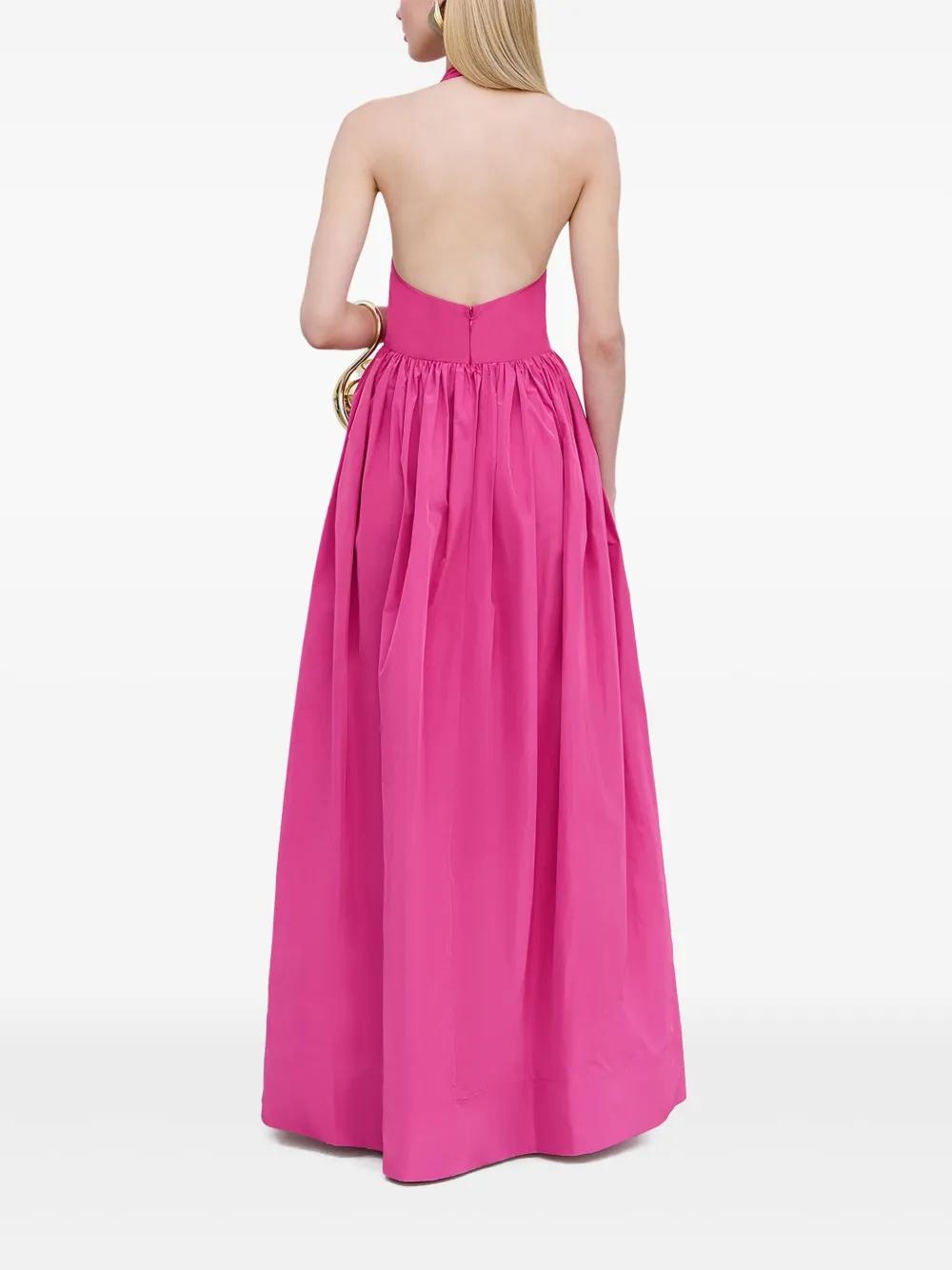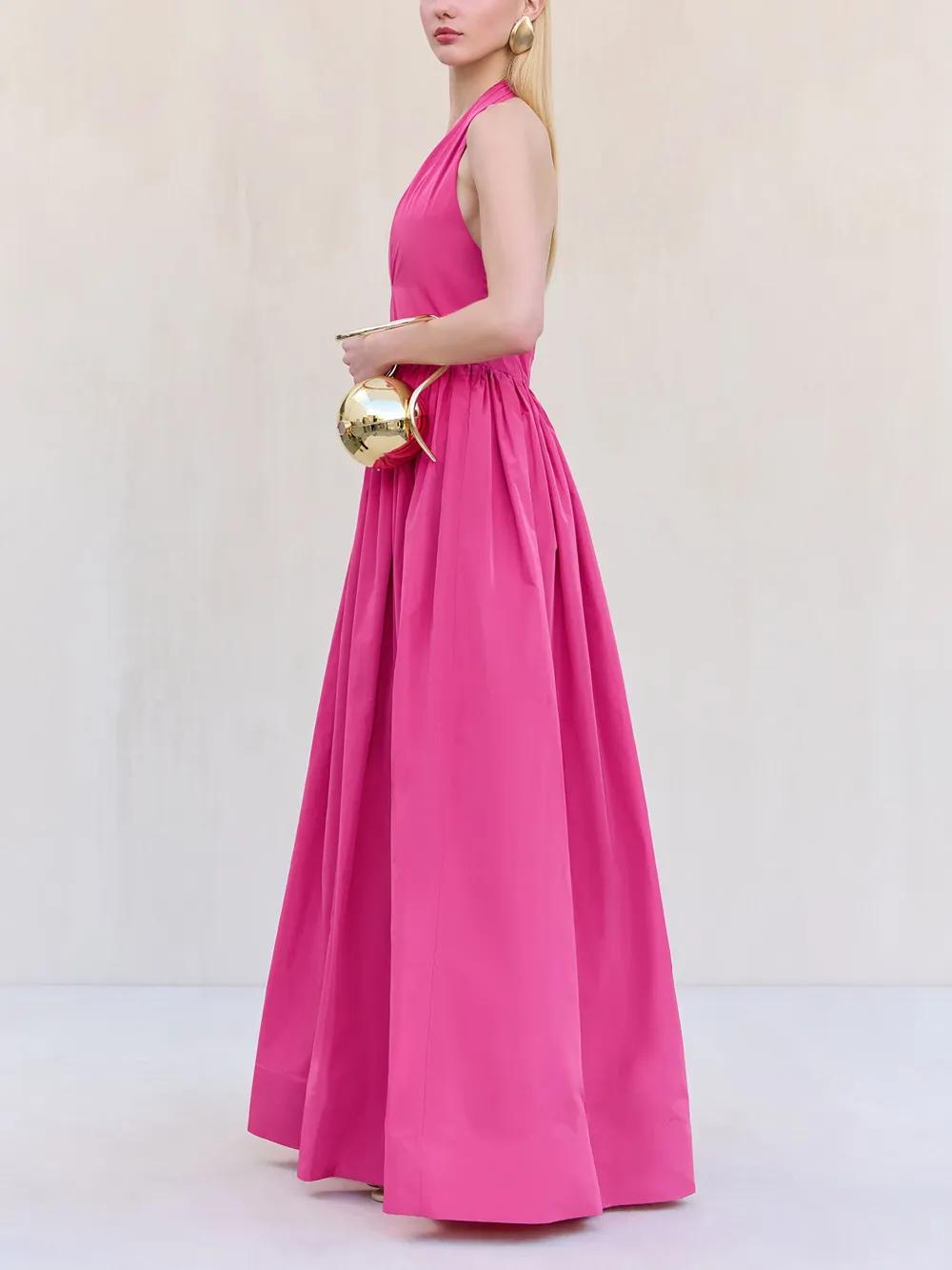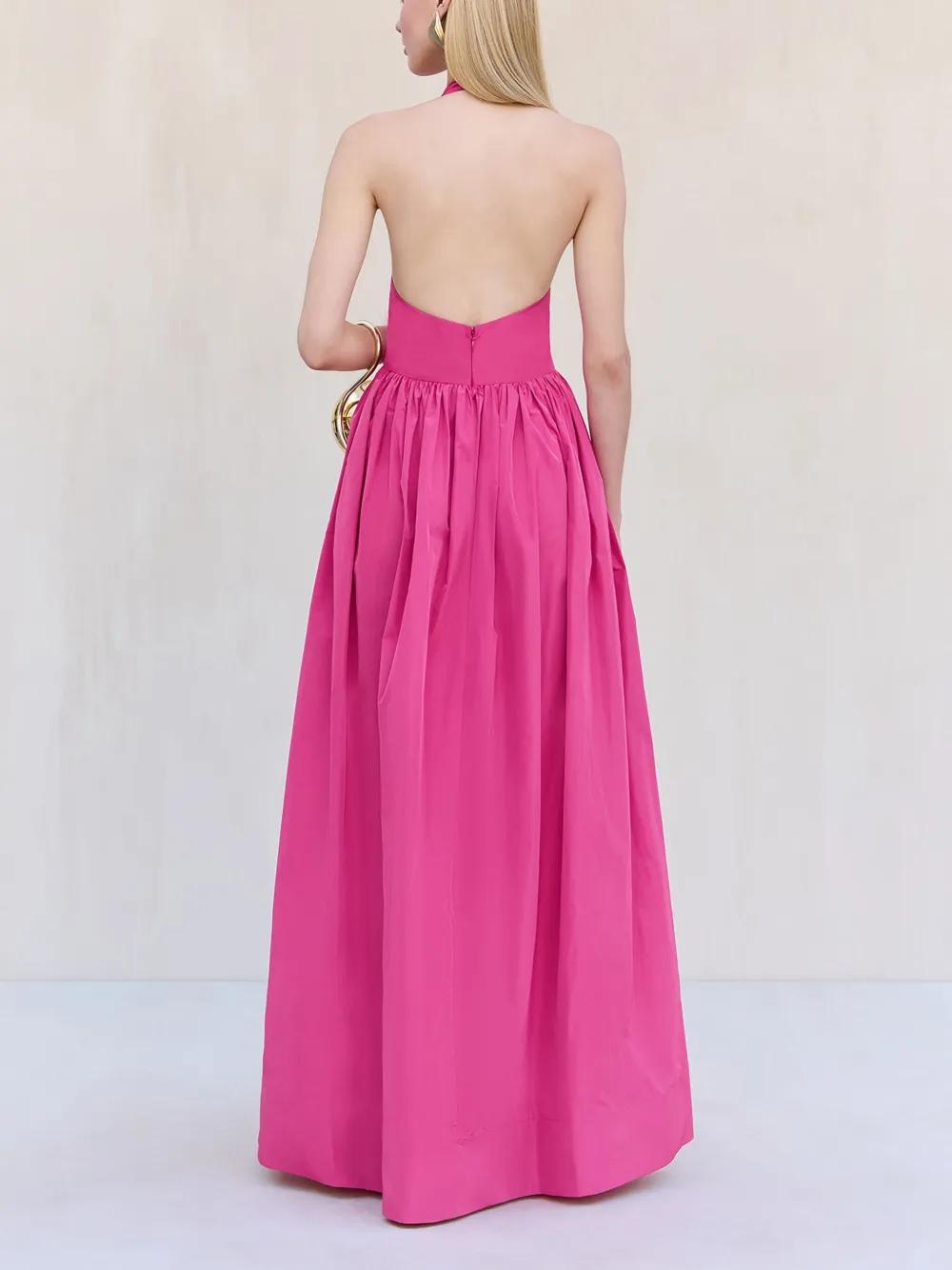pink plunging V-neck halterneck sleeveless two side slit pockets straight hem