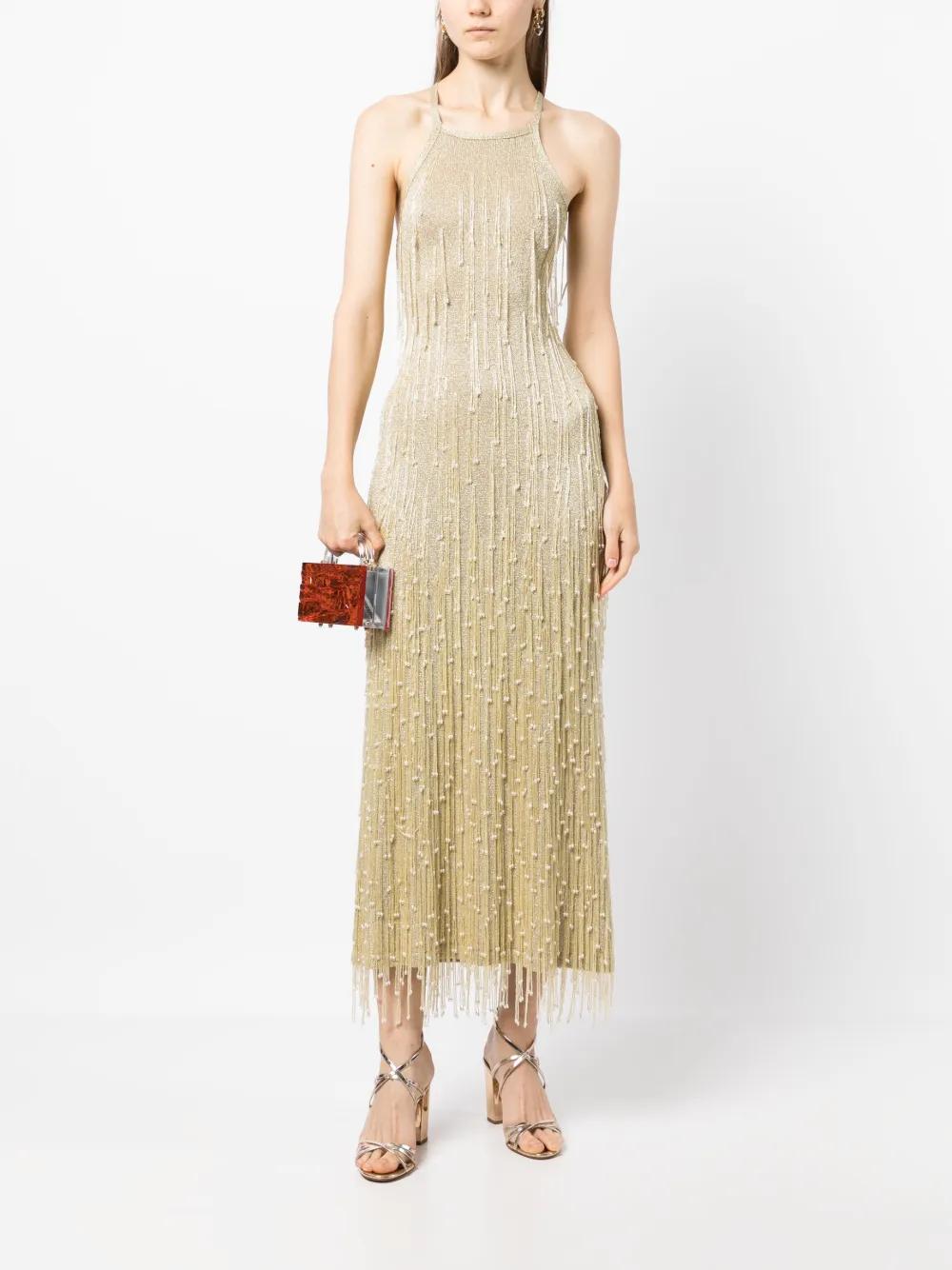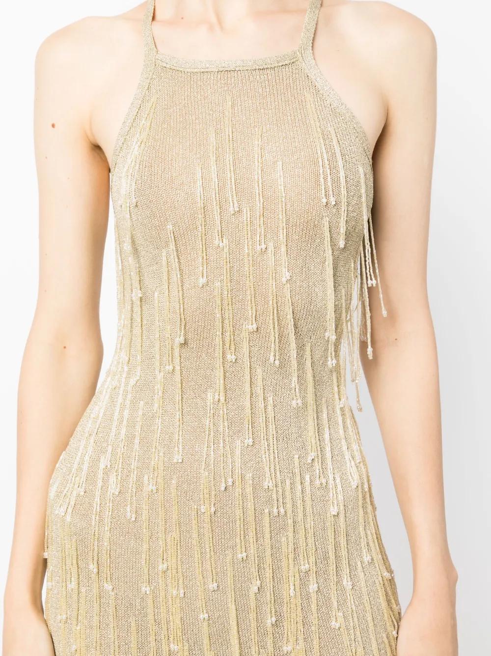 gold-tone knitted construction draped design metallic threading cut-out detailing fringe detailing faux-pearl embellishment halterneck sleeveless rear criss-cross straps rear tie fastening mid-length