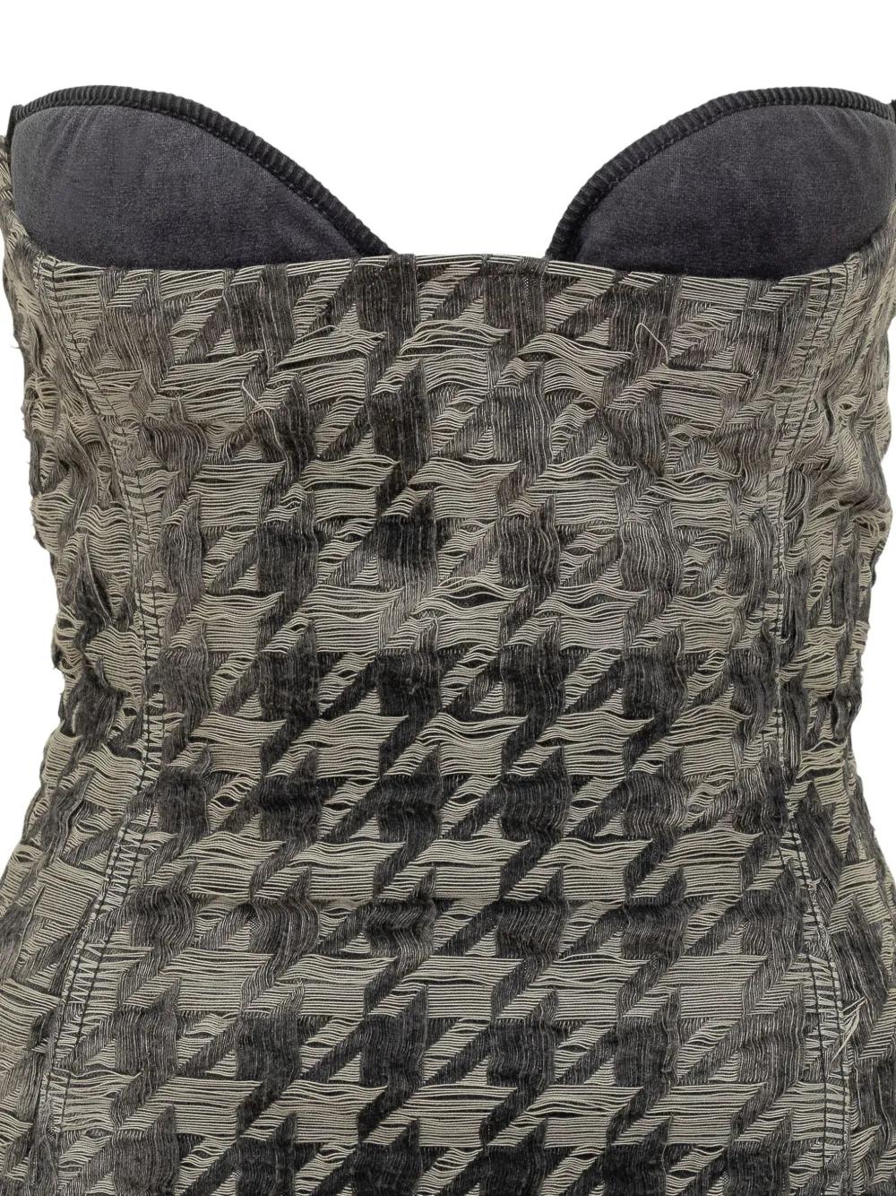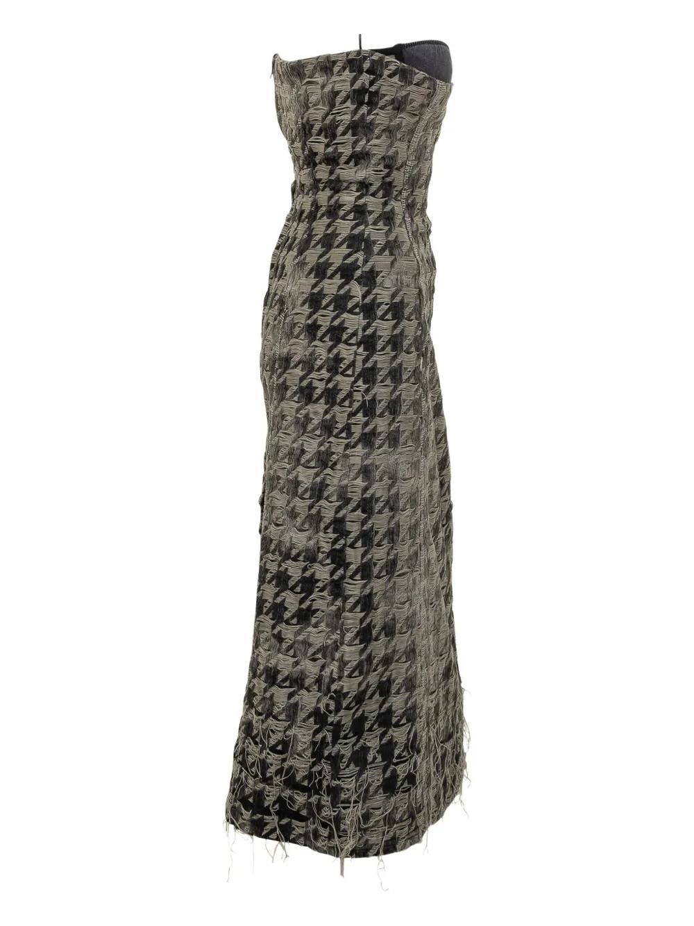 black and beige houndstooth pattern strapless neckline fitted bodice frayed hemline concealed zip fastening