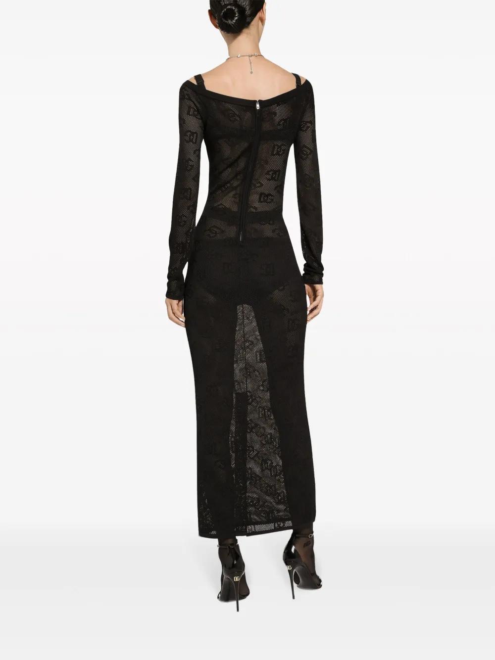 black jacquard logo motif mesh design rear zip fastening rear slit V-neck long sleeves maxi straight hem