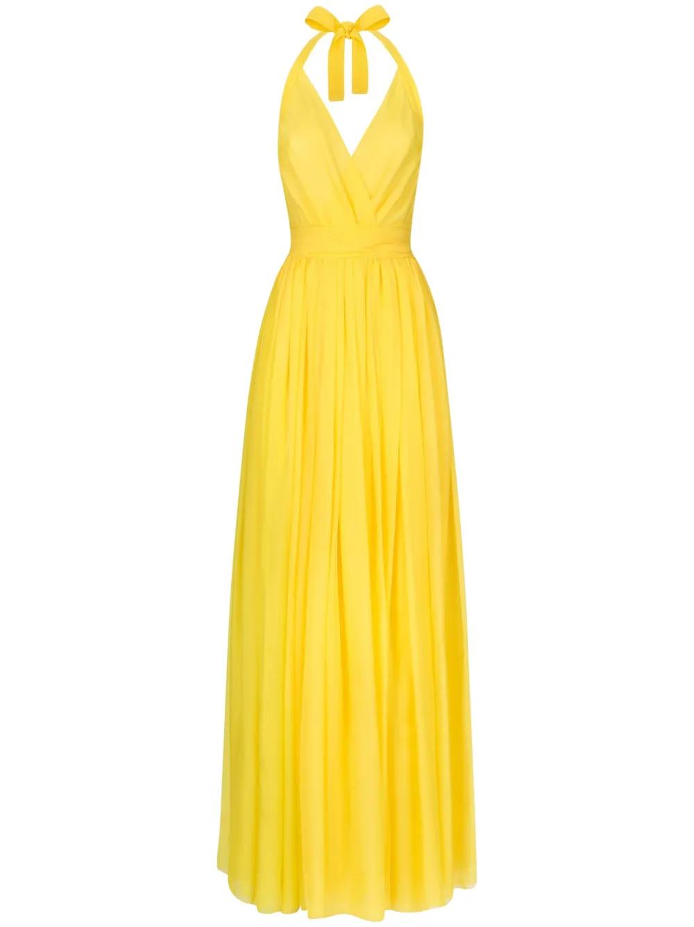 yellow silk fully pleated halterneck tie fastening plunge style open back sleeveless floor-length