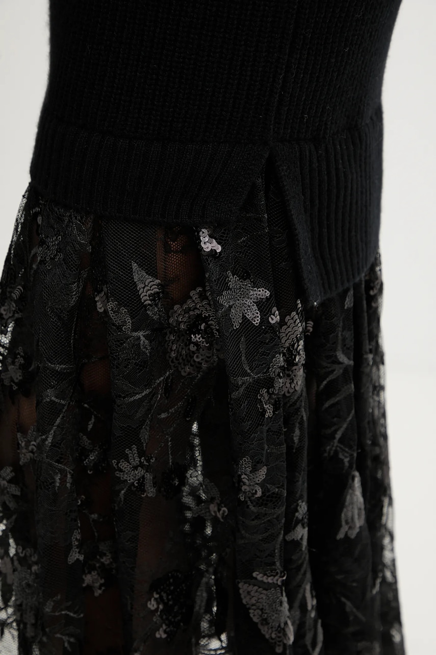 - Prosty, nie blokujący ruchów fason. - Model z półgolfem. - Rękaw raglanowy, dzięki swojej konstrukcji, zapewnia większą swobodę ruchu. - Prążkowana dzianina. - Koronkowa wstawka. - Model z ozdobną aplikacją z cekinów. - Gruba, elastyczna dzianina. - Długość rękawa(mierzona od dekoltu): 71 cm. - Długość: 135 cm. - Szerokość pod pachami: 50 cm. - Szerokość w talii: 50 cm. - Wymiary podane dla rozmiaru: 36.