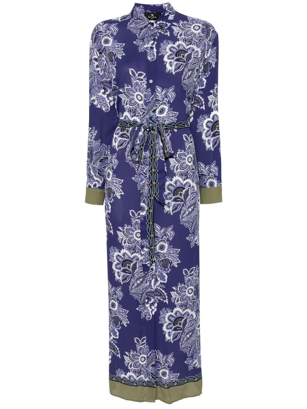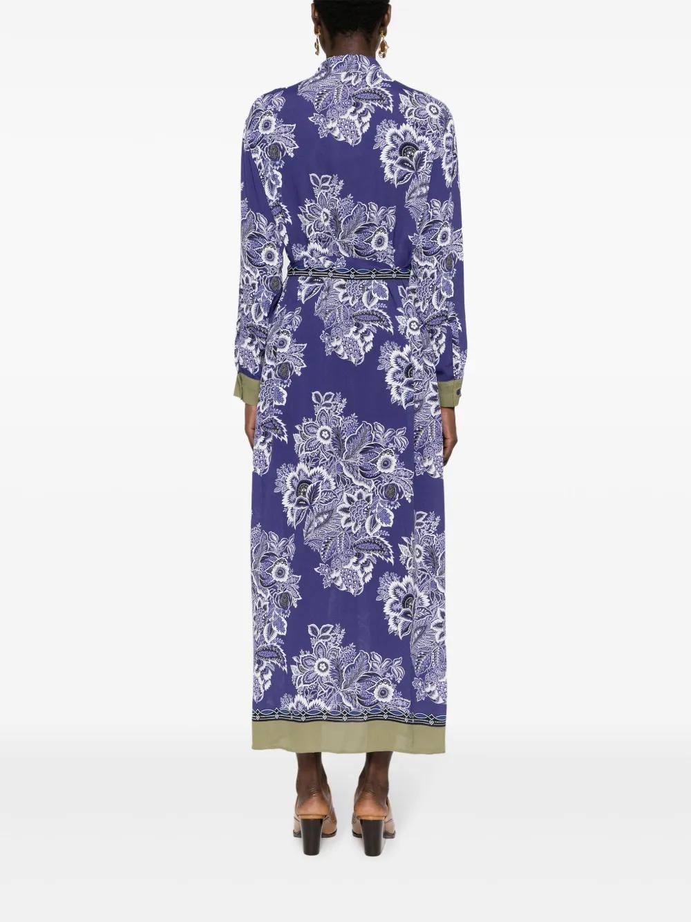 blue, khaki multicolour crepe de chine all-over floral print semi-sheer construction classic collar long sleeves buttoned cuffs detachable waist belt side slits contrasting trim front button fastening