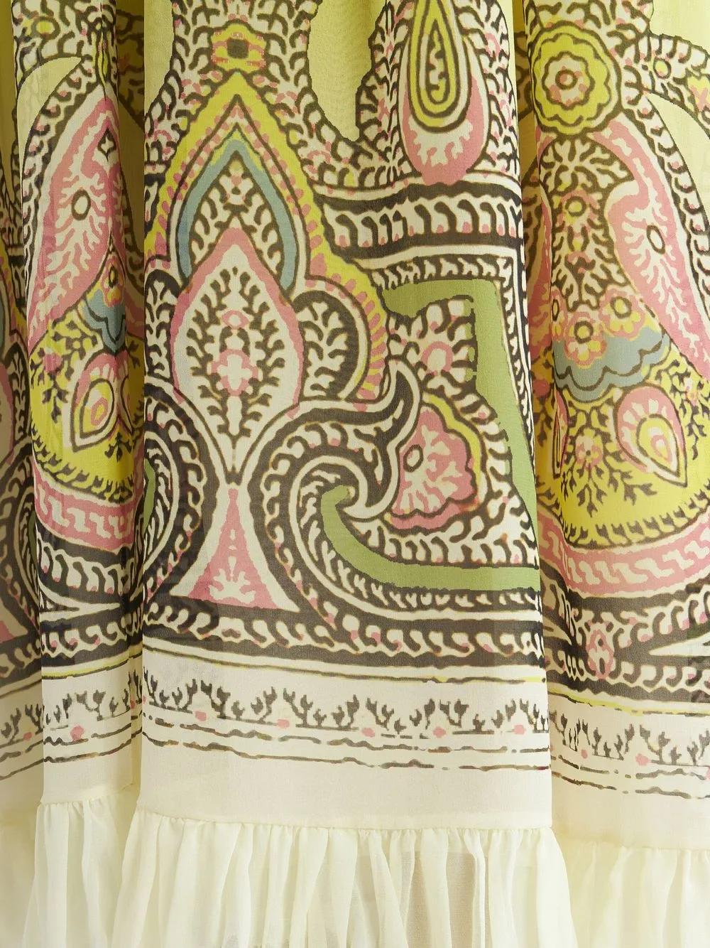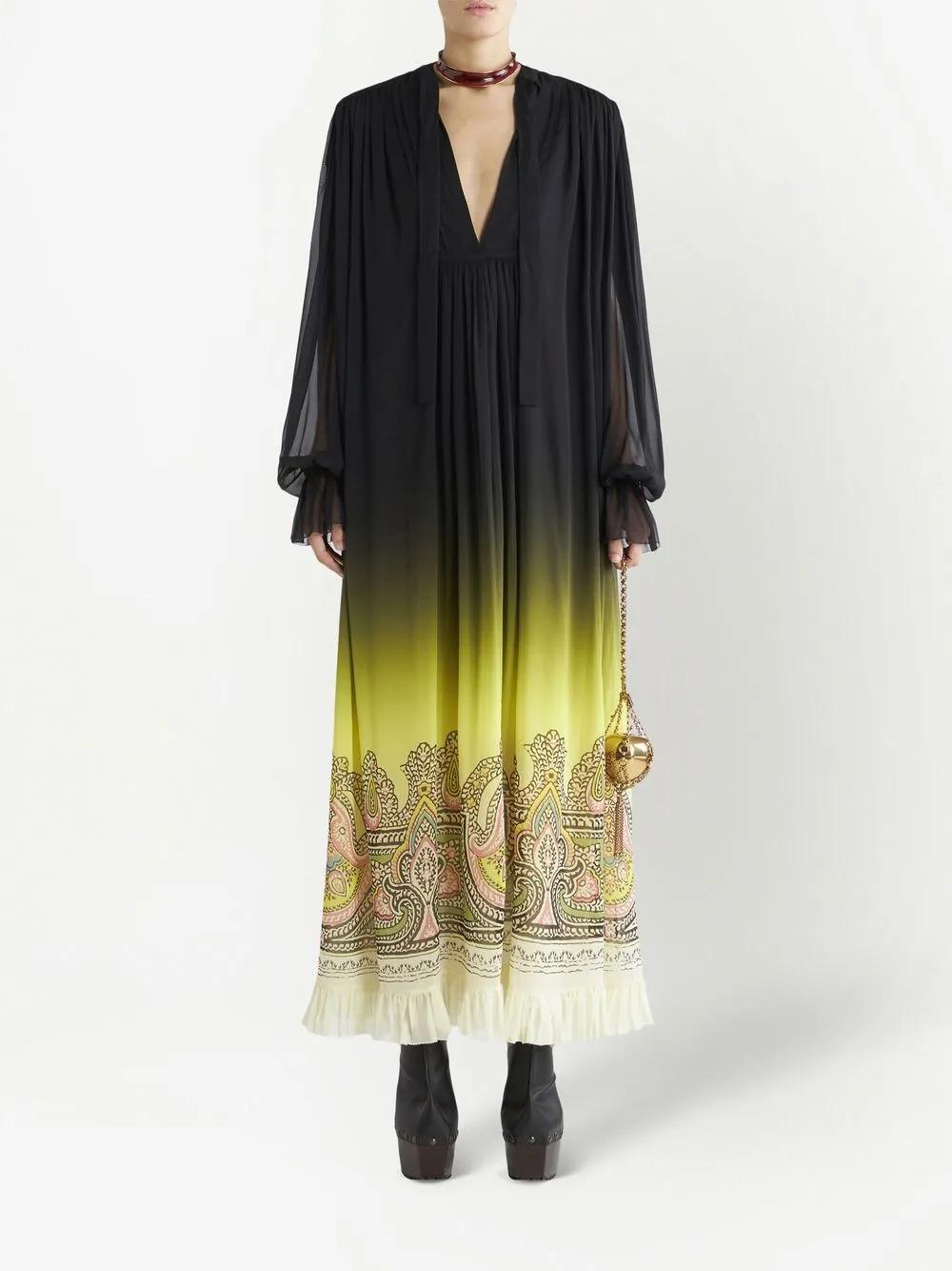 black/lime green silk paisley print gradient effect front tie fastening long puff sleeves shift style ankle-length