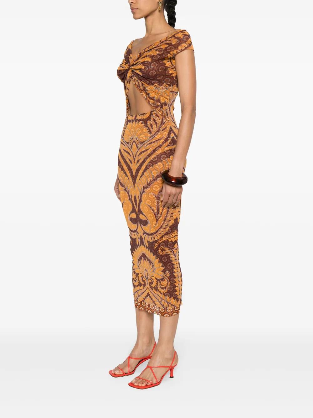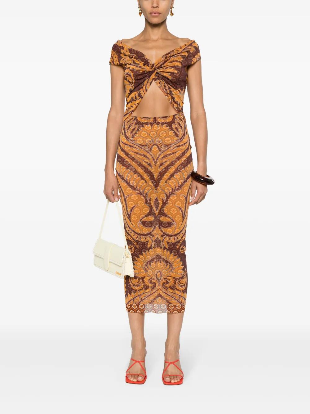 orange/brown mesh design all-over graphic print V-neck knot detailing sleeveless cut-out detailing long length straight hem