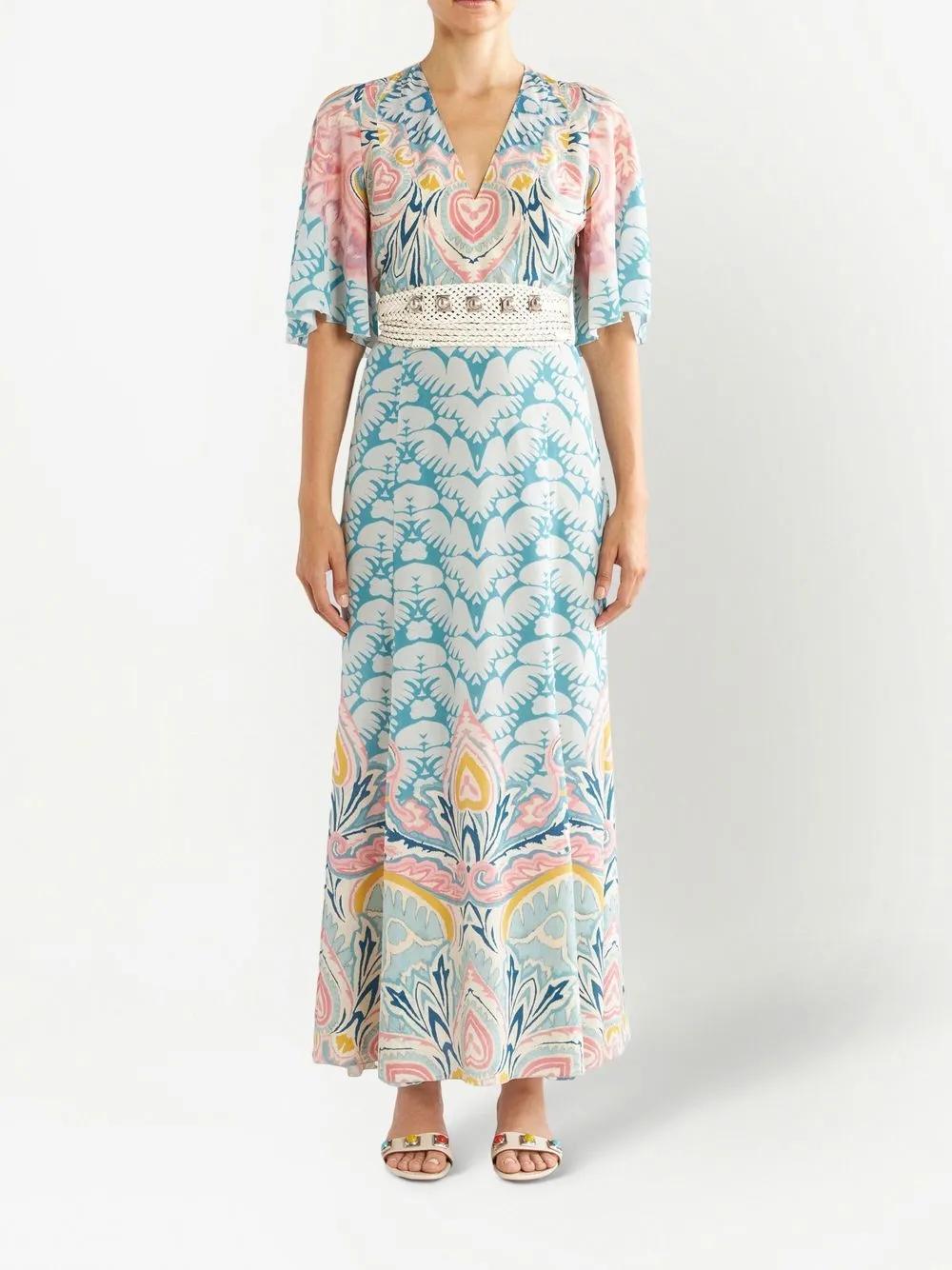 sky blue/blush pink/mustard yellow silk paisley print V-neck short sleeves pleated skirt ankle-length straight hem
