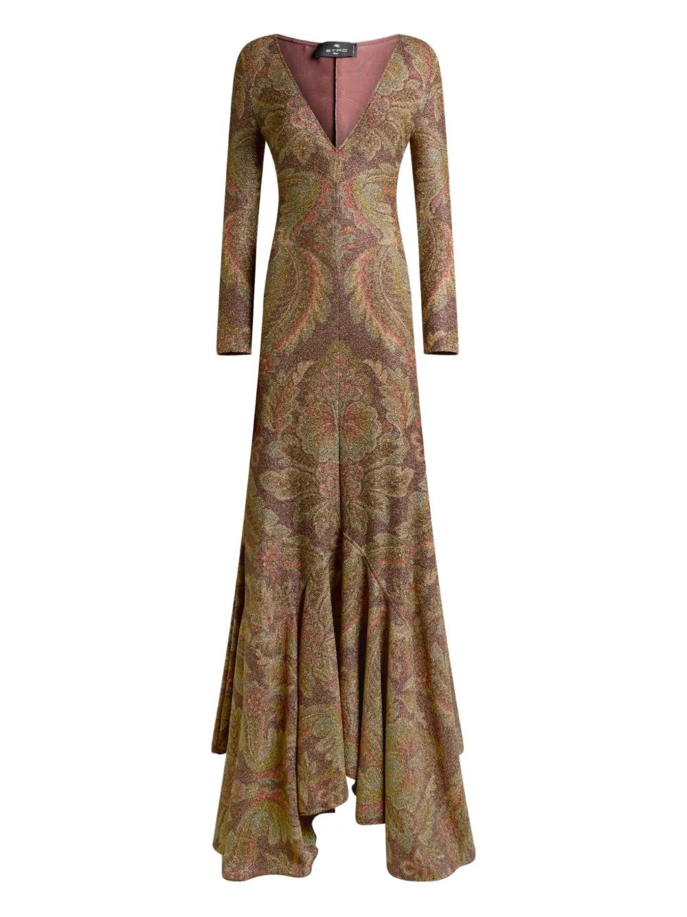 brown paisley print V-neck long sleeves fitted bodice ruffled hem