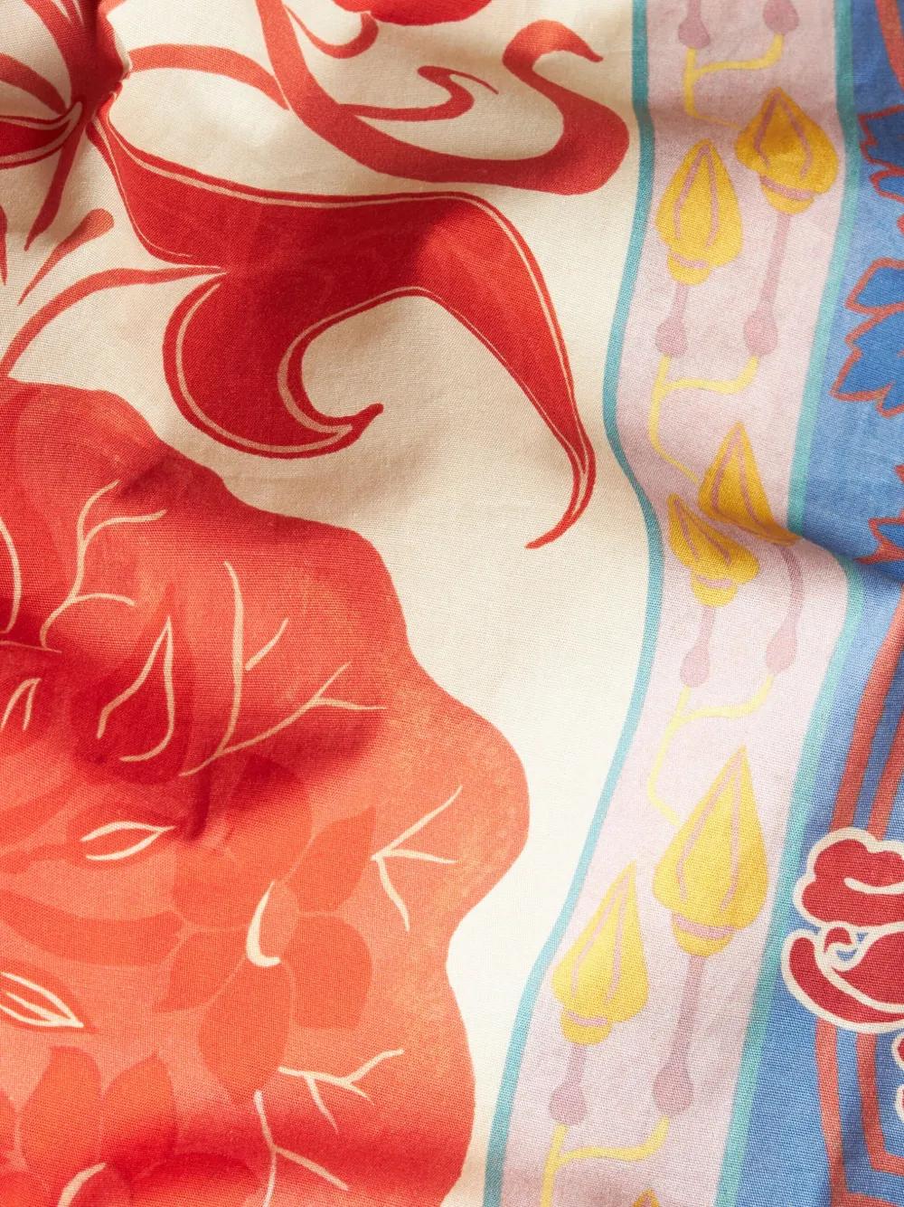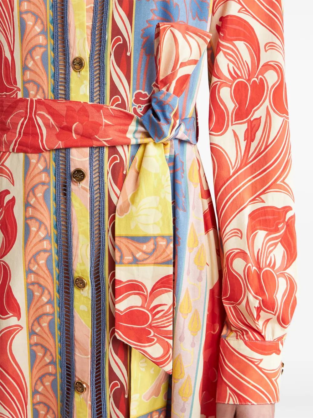 red multicolour cotton blend straight-point collar front button fastening floral print panelled design belted waist long sleeves mid-length