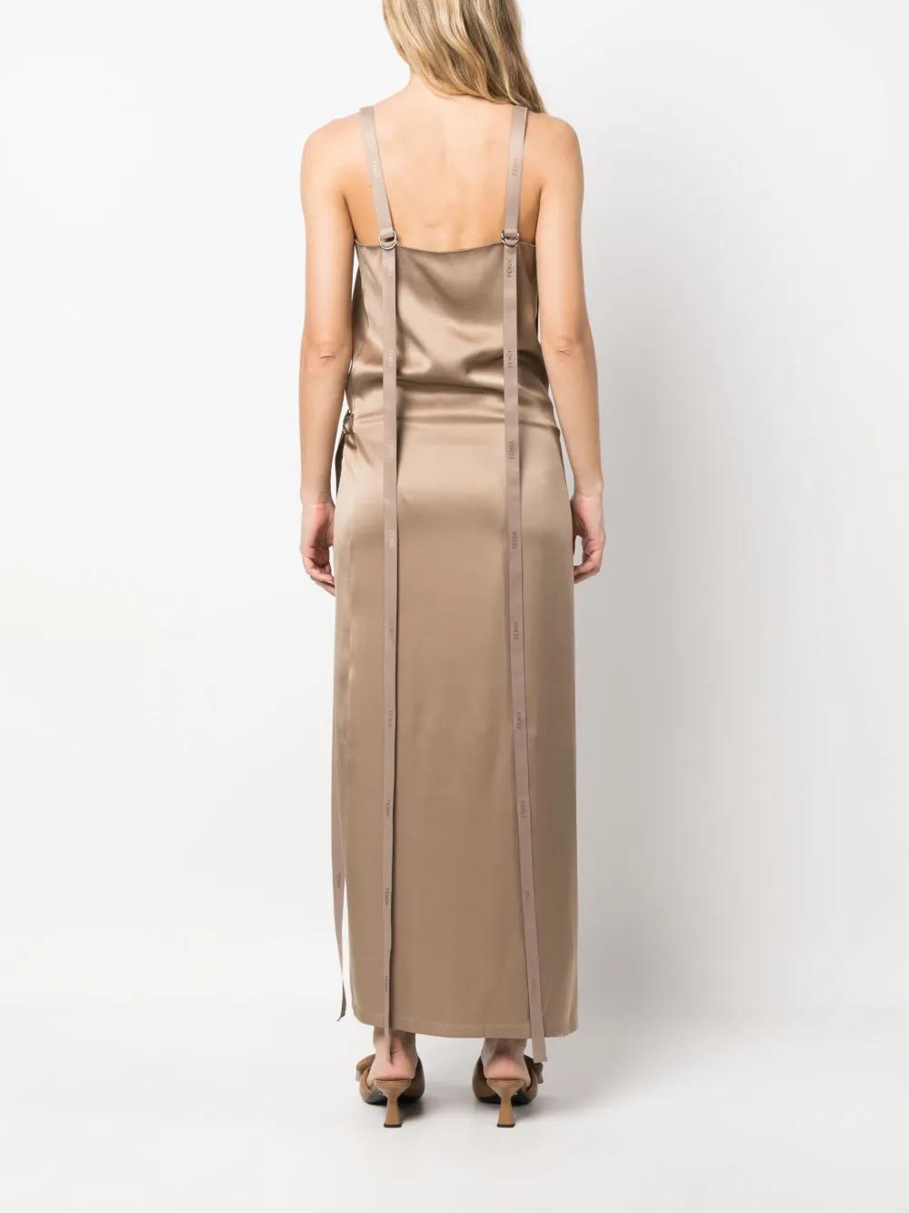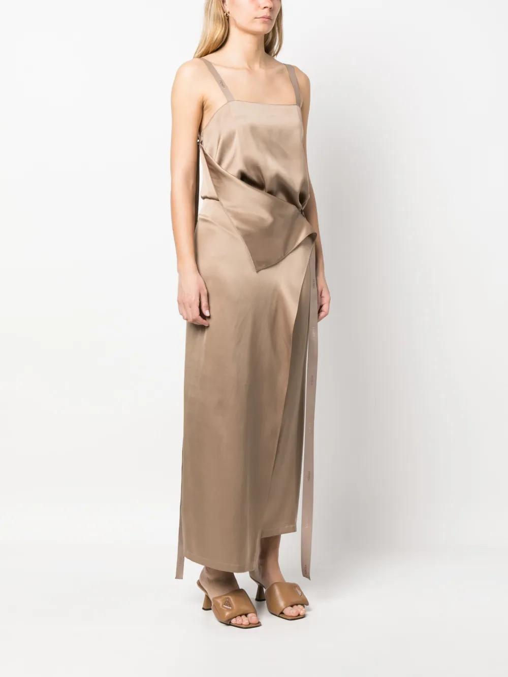 light brown silk satin finish asymmetric design strap detailing square neck tied waist wide shoulder straps straight hem