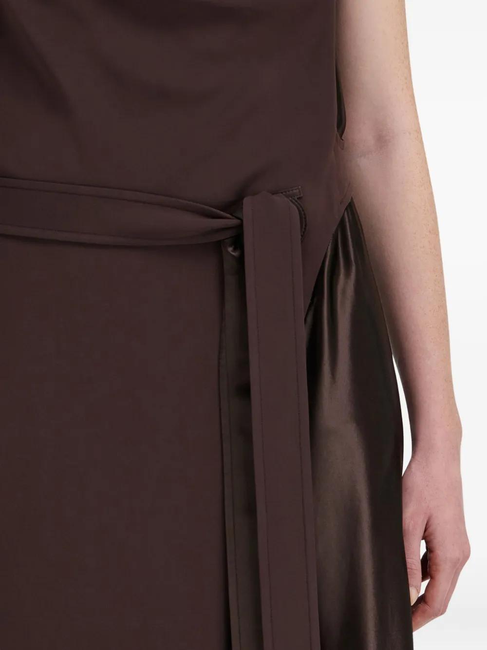 dark brown cowl neckline sleeveless asymmetric hem self-tie belt satin side panel