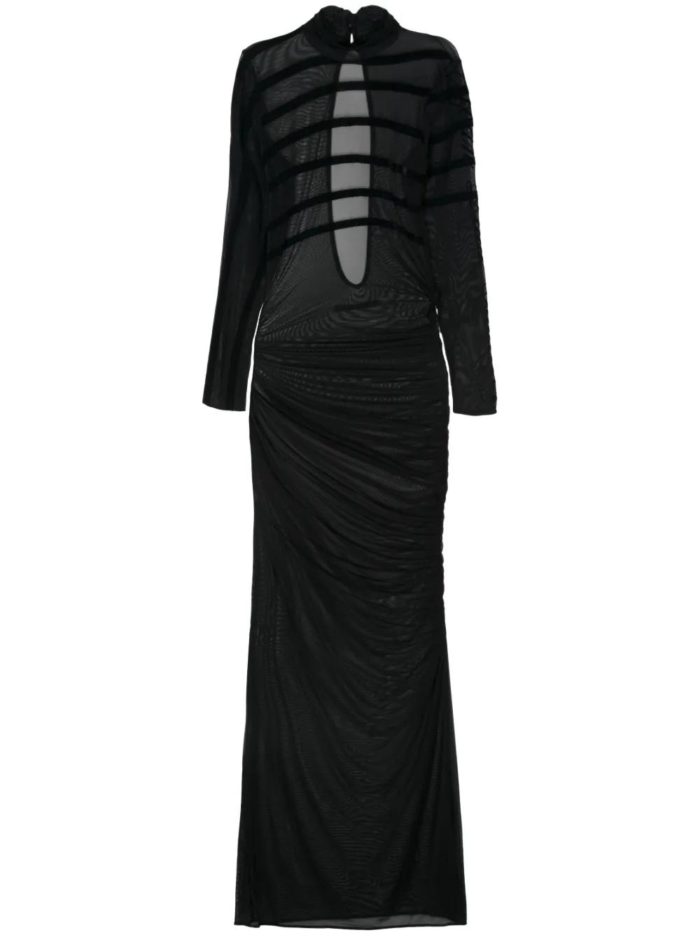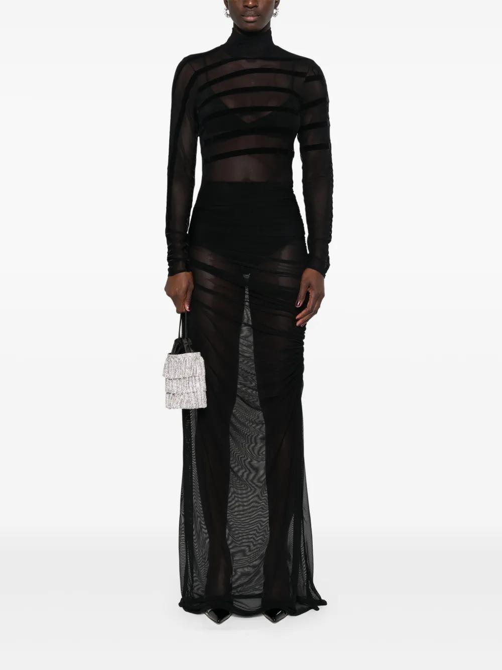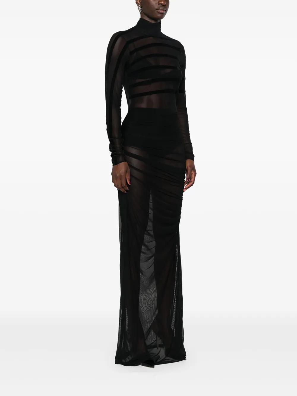 black stretch-design mesh design semi-sheer construction flocked stripe pattern high neck long sleeves with flocked logo ruched detailing floor-length keyhole detail to the rear straight hem unlined rear hook fastening