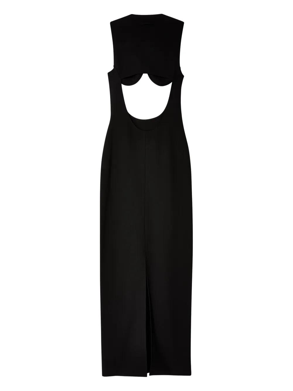 black jersey texture cut-out detailing V-neck sleeveless rear slit long length straight hem