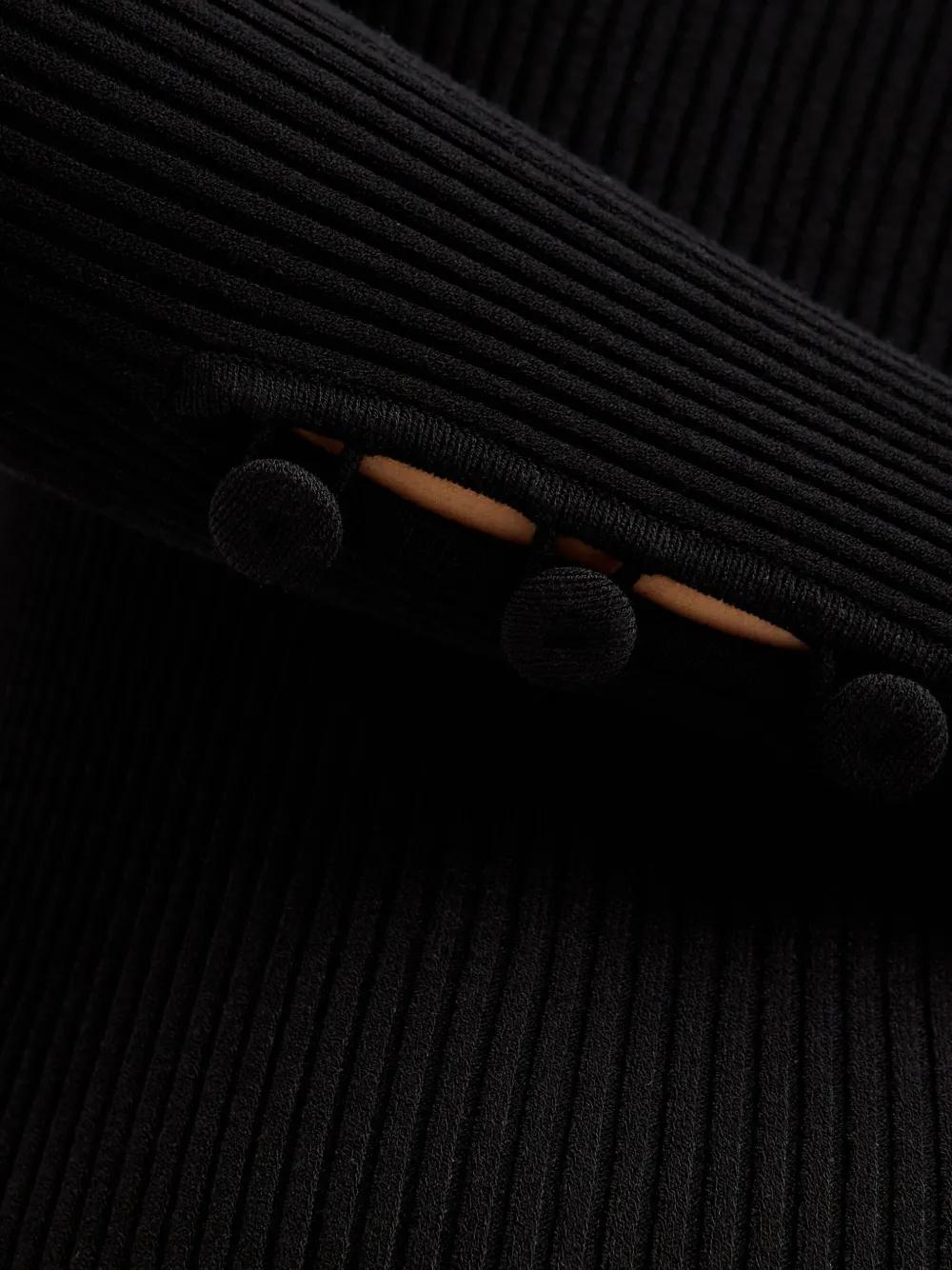 black ribbed knit asymmetric neck one sleeve glove detail buttoned cuff