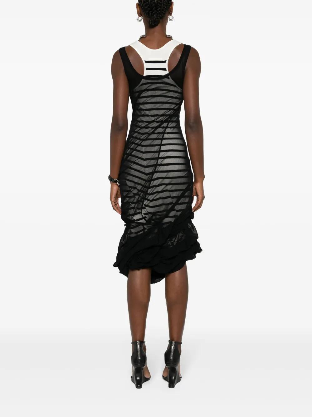 white/navy blue/black fine ribbed horizontal stripe pattern tulle overlay ruched detailing scoop neck sleeveless calf-length unlined