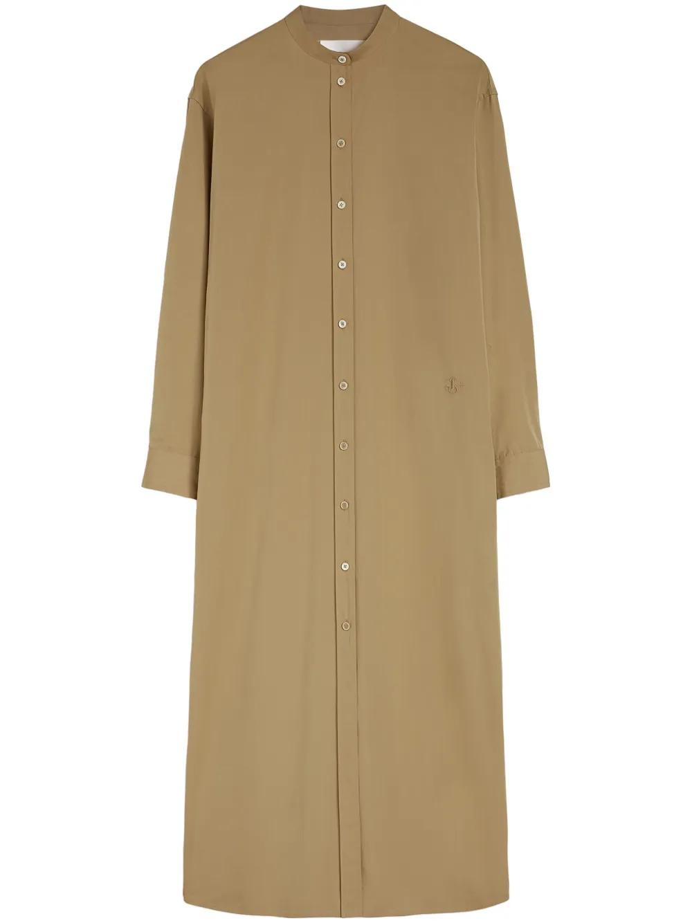 sand brown cotton poplin texture front button fastening collarless drop shoulder long sleeves embroidered logo side slit straight hem long length