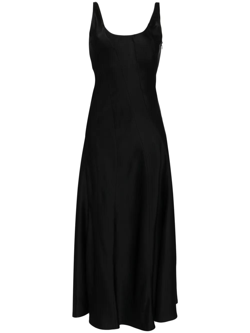 black seam detailing square neck sleeveless low back concealed side hook and zip fastening calf-length
