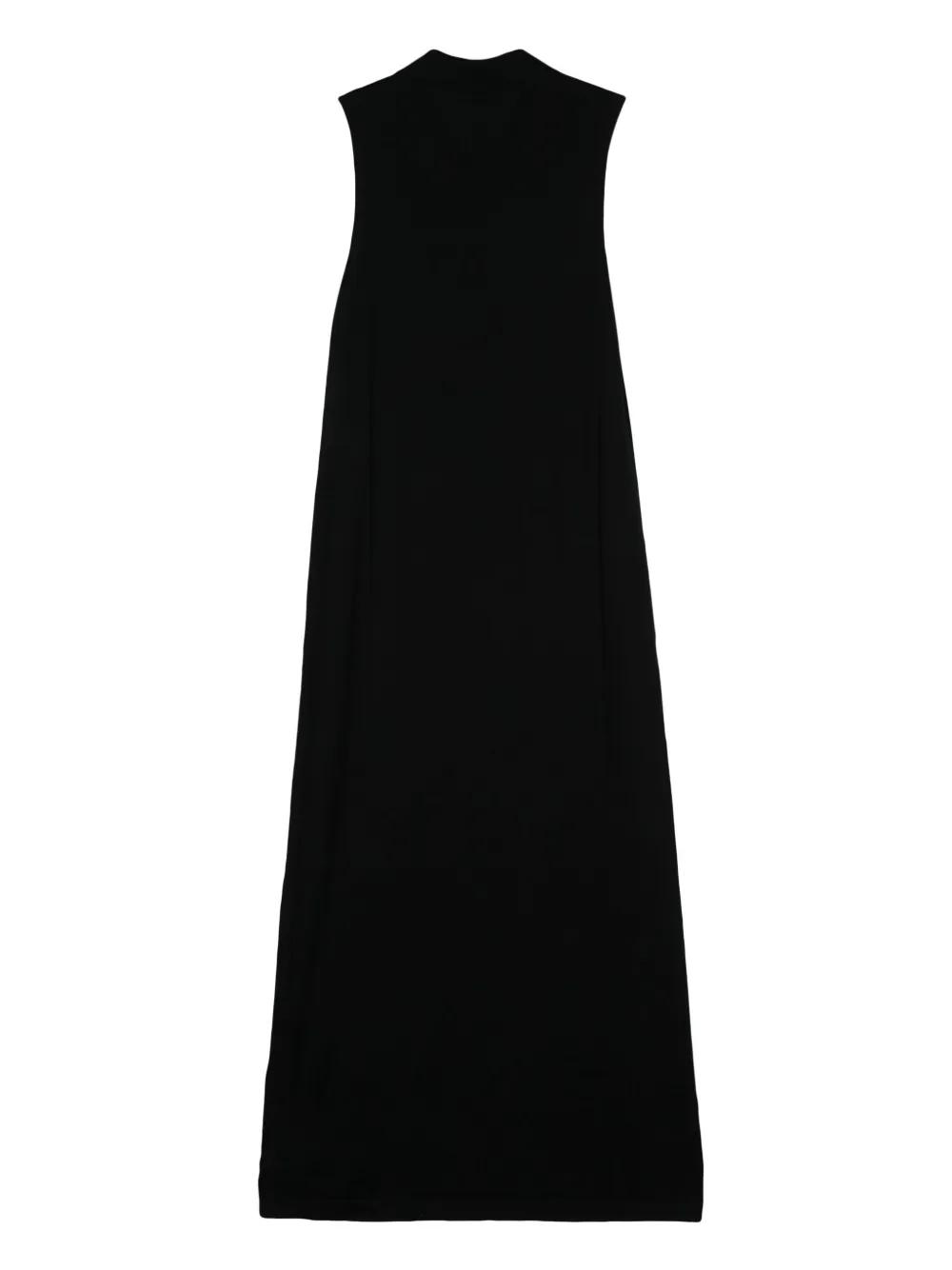 black wool fine knit brooch detail spread collar sleeveless flared skirt straight hem long length unlined
