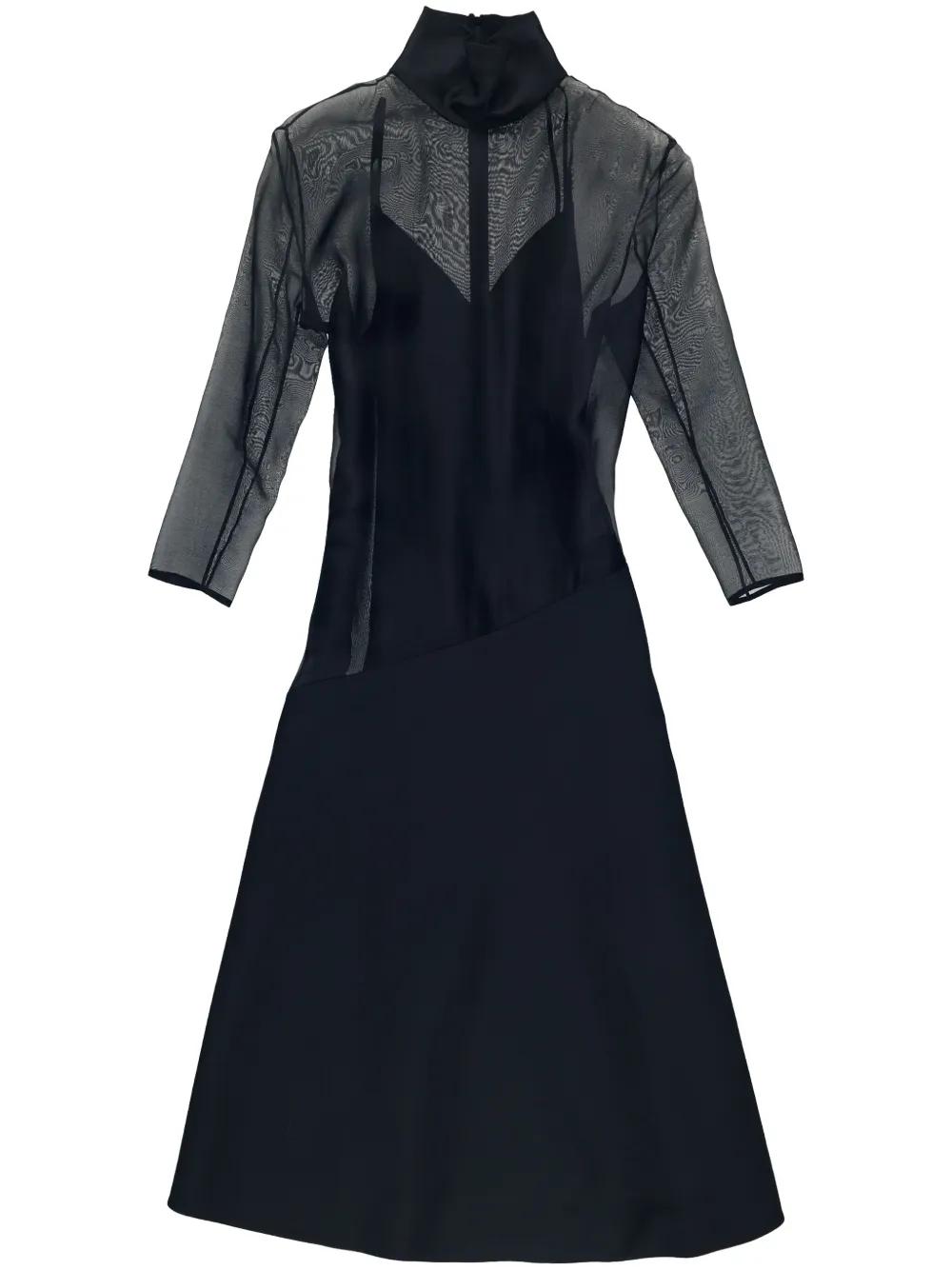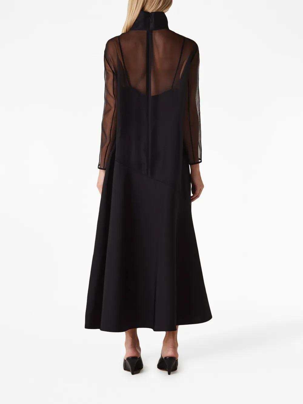 black silk organza semi-sheer overlay double layer high neck concealed rear zip fastening long sleeves flared hem