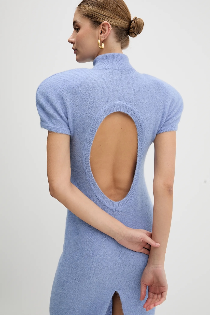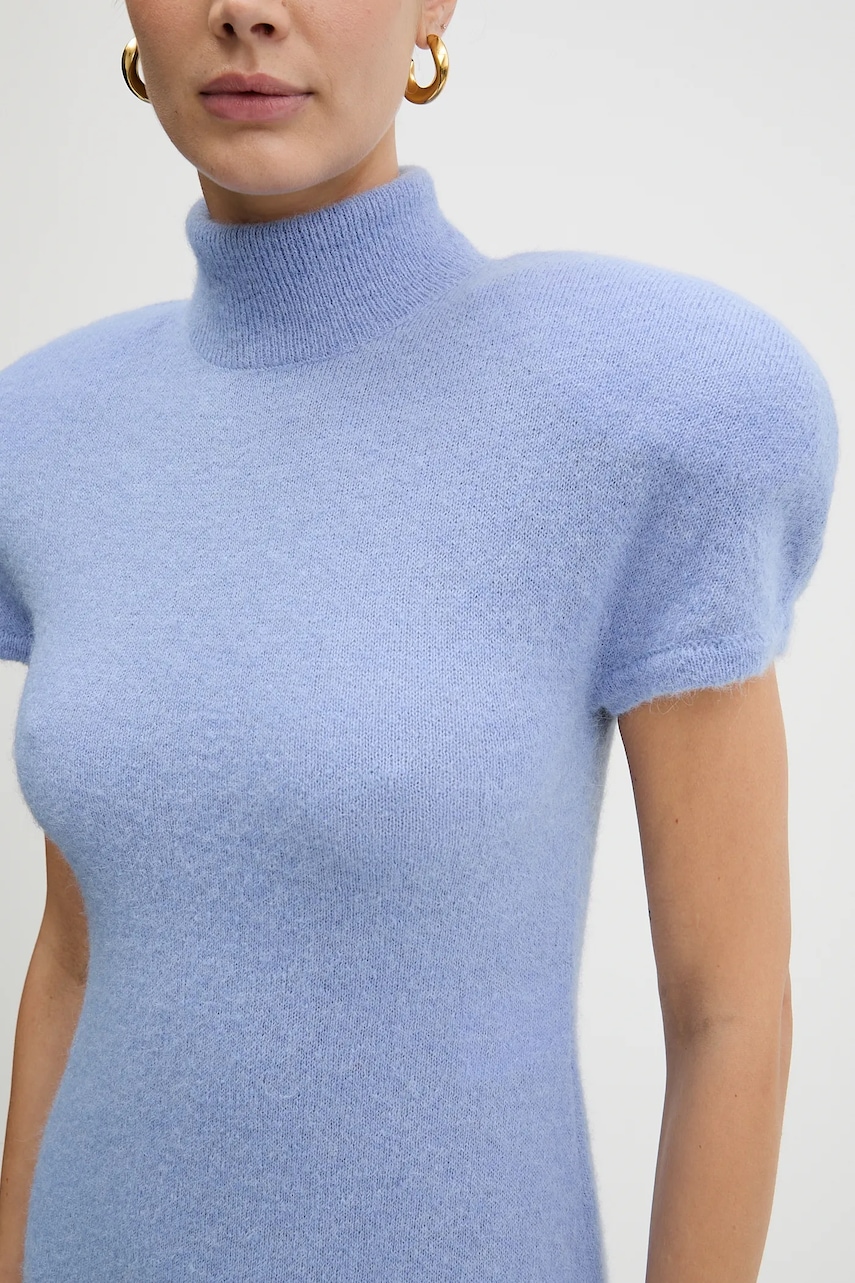 - Model o długości maxi. - Model z golfem. - Krótki rękaw. - Dopasowany fason. - Cienka, nieelastyczna dzianina. - Z tyłu rozcięcie, które zapewnia większą swobodę podczas poruszania. - W ramiona wszyte poduszki. - Odkryte plecy. - Długość: 139 cm. - Szerokość pod pachami: 39 cm. - Wymiary podane dla rozmiaru: 34/36.