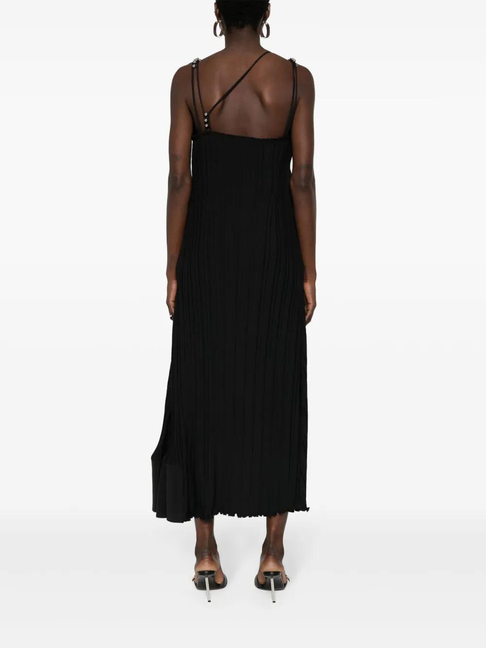 black fully pleated bead embellishment ruffled detailing spaghetti straps V-neck sleeveless unlined asymmetric hem concealed side zip fastening