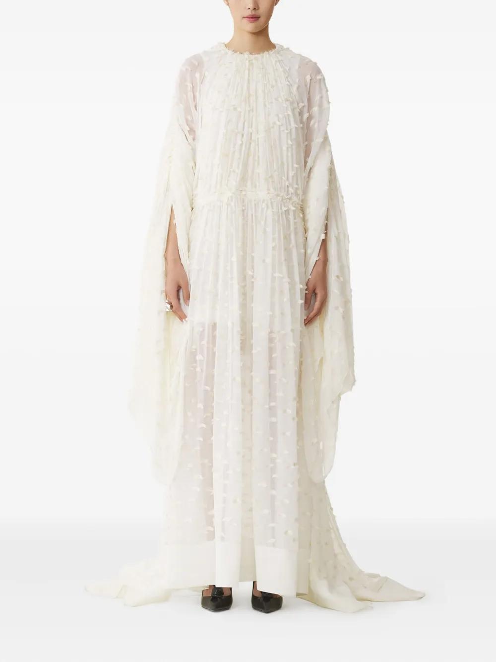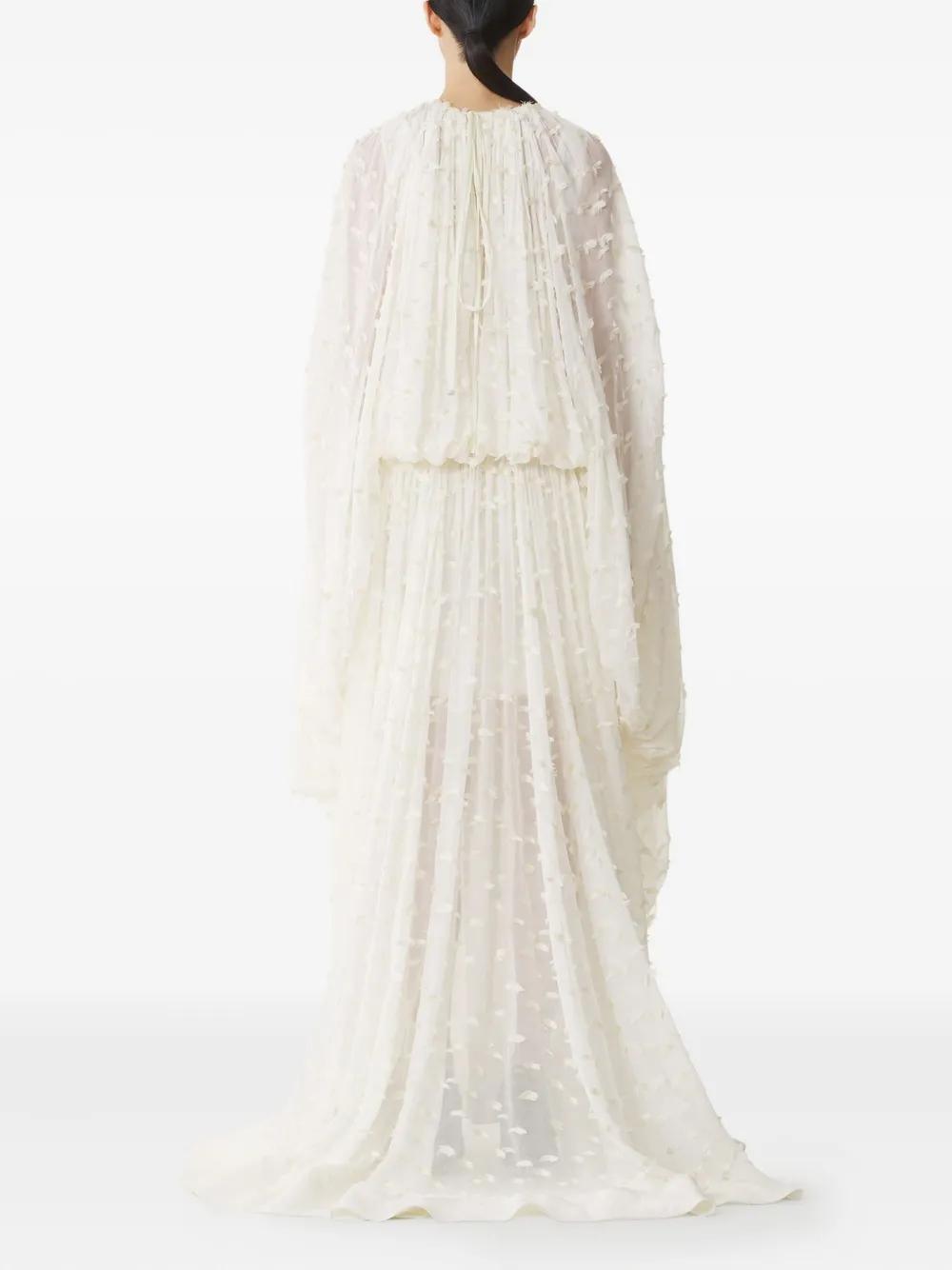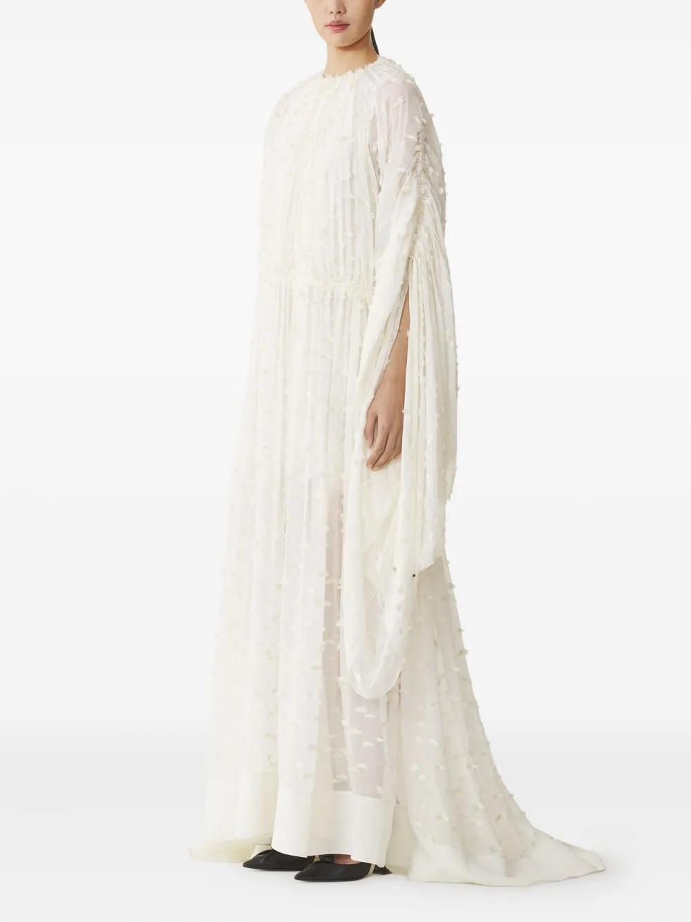 white silk-blend pleated bodice long sleeves asymmetric hem